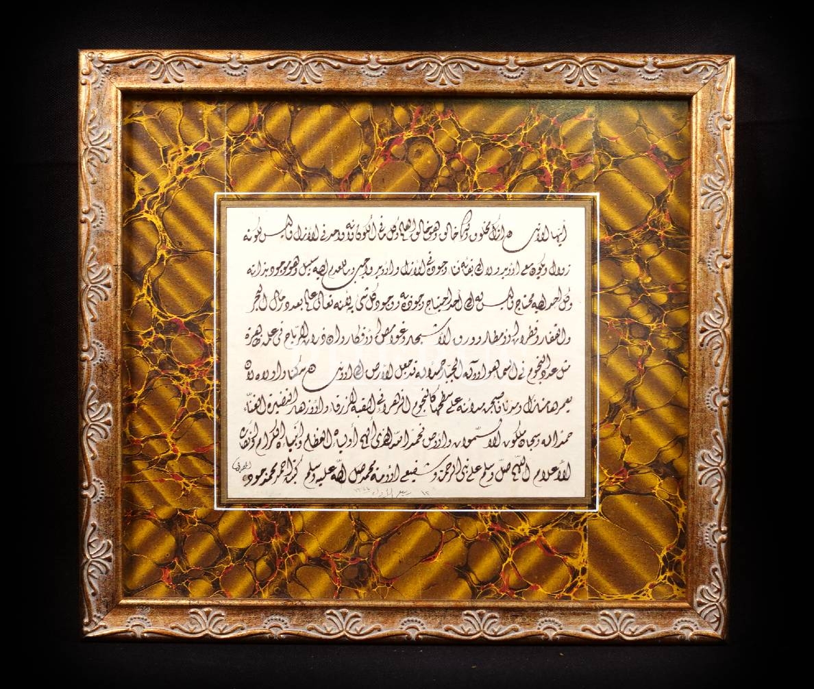 el-Mısrî ketebeli ve 1344 tarihli Arapça divânî yazı: "Eyyühe'l-insan inneke mahlûkun ve leke hâlikun... [Ey İnsan! Sen yaratılmışsın ve senin bir yaratıcın var...]", çerçeveli, yazı: 14x17 cm