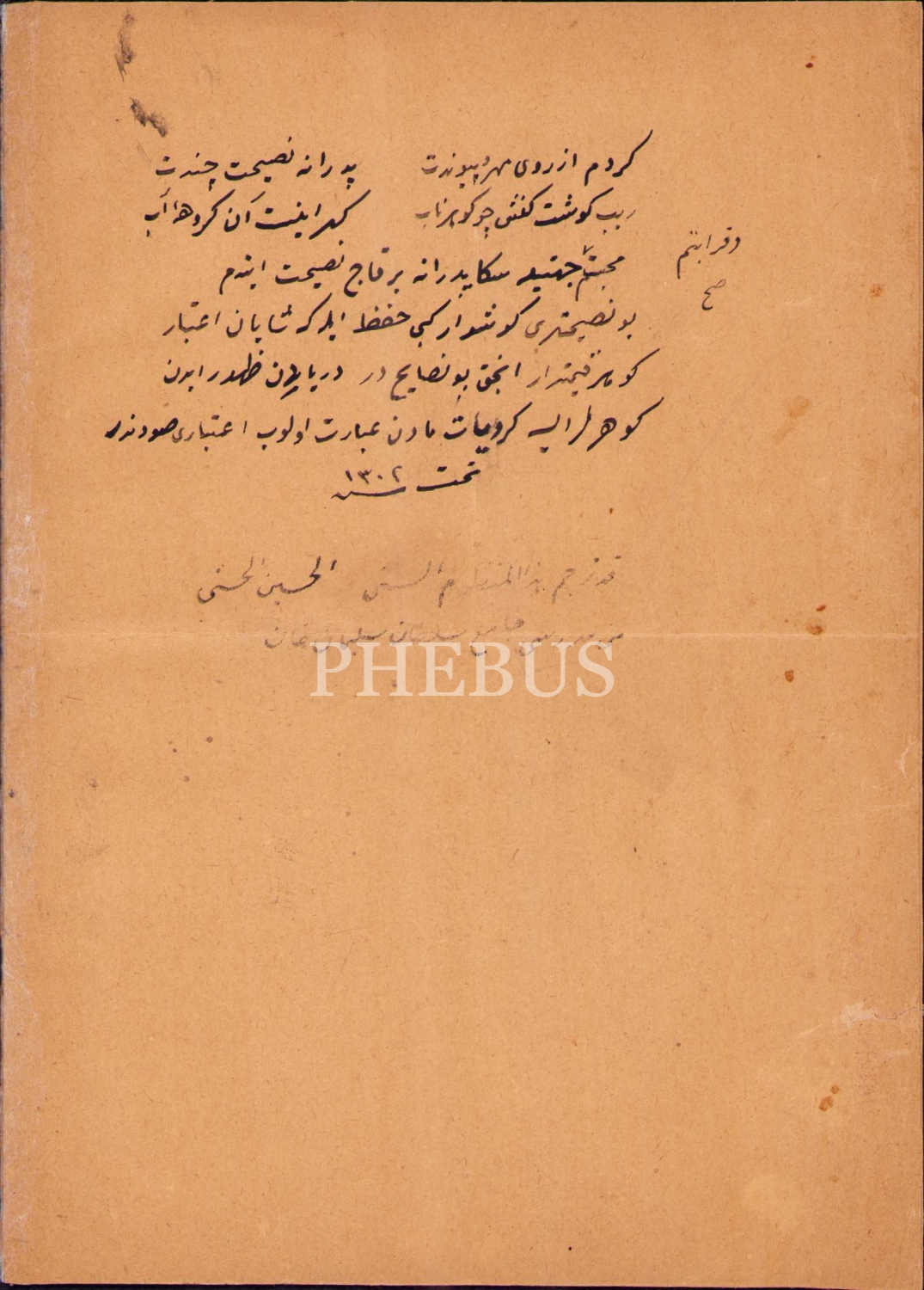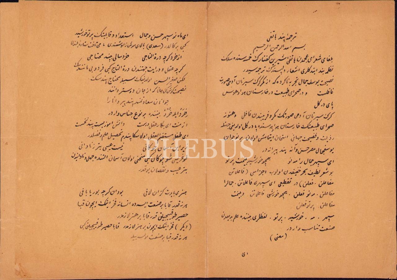 2 adet yazma eser bir arada: Farsça-Osmanlıca Tercüme-i Pend-i Hâtifî, çev. el-Hüseyin el-Hüsnü, 1302 tarihli, 11 s., 13x19 cm