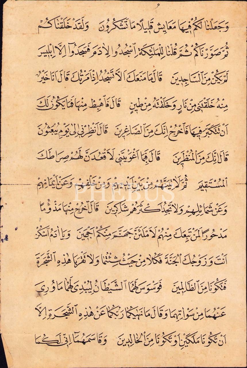 Hoca işi nesih hatla ayetler: A'râf suresi 10-21. ayetler, 25x36 cm, kenarları hafif yırtık haliyle