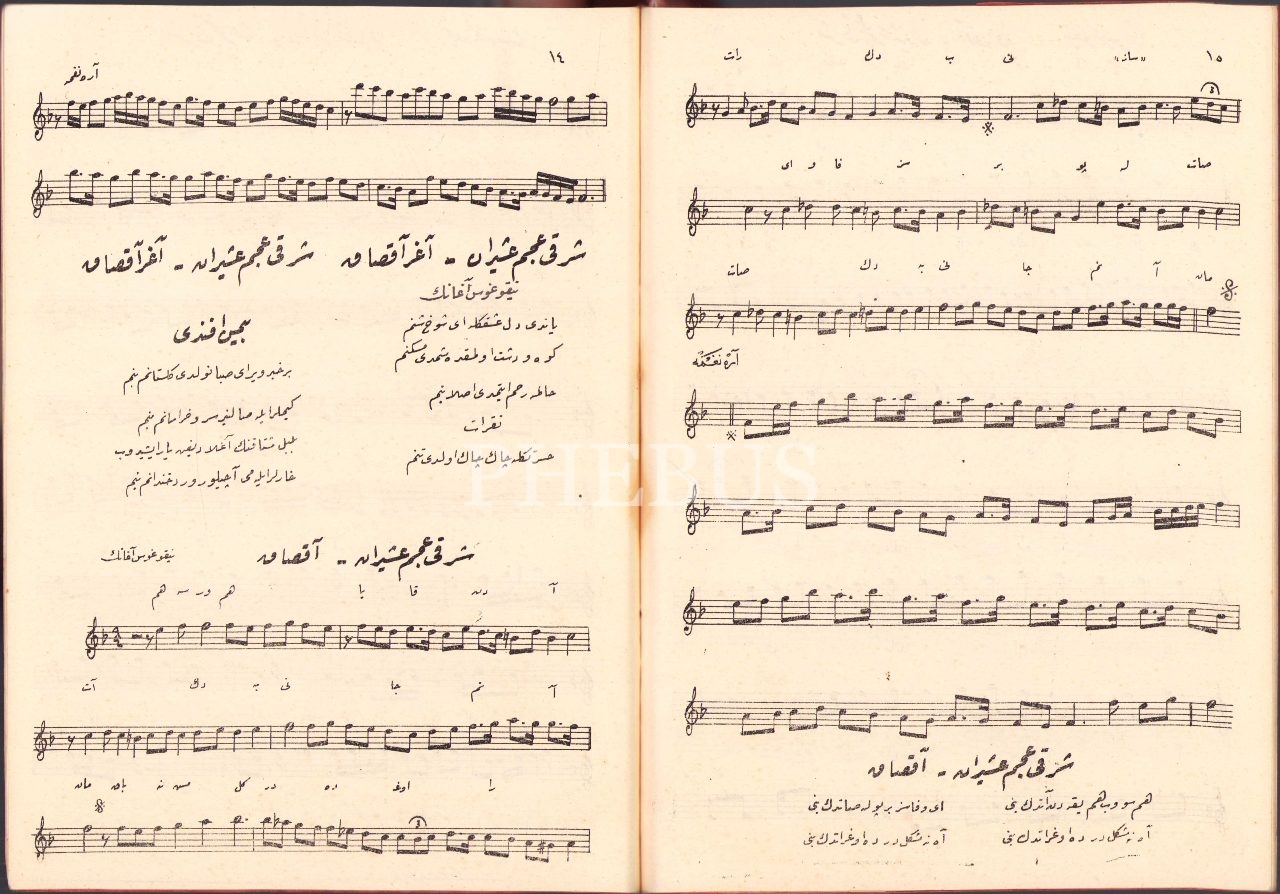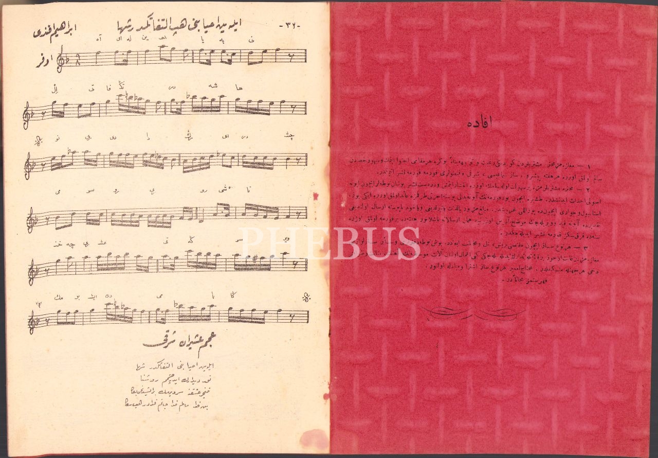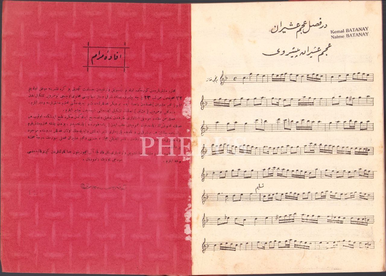 "Piyasa turunda yazılmış 32 sahifeden mürekkeb [oluşan] 23 parça pişrev, saz semaisi beste ve şarkılar"