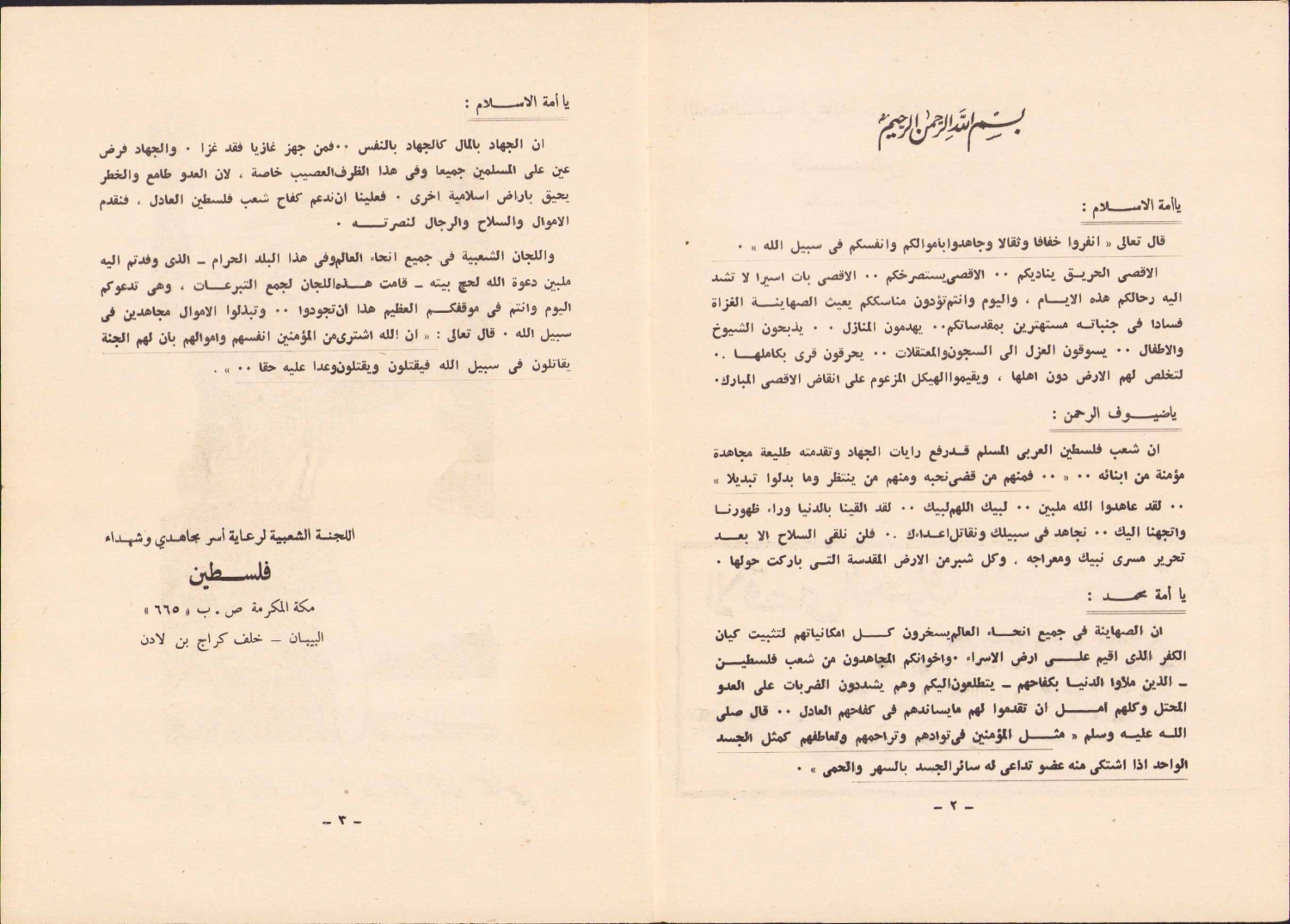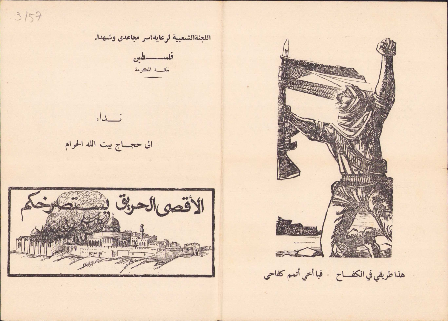 Nida - 'Mescidi Aksa çığlık atıyor', Mücahidlerin ve Şehitlerin Bakımı Halk Komitesi, Filistin, Arapça propaganda bildirisi, 17x25cm