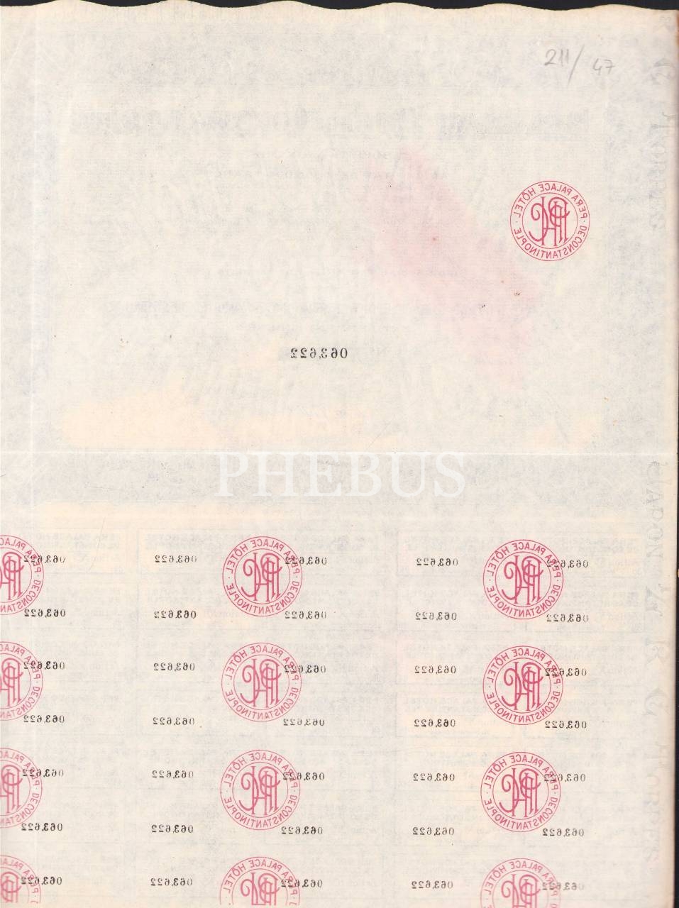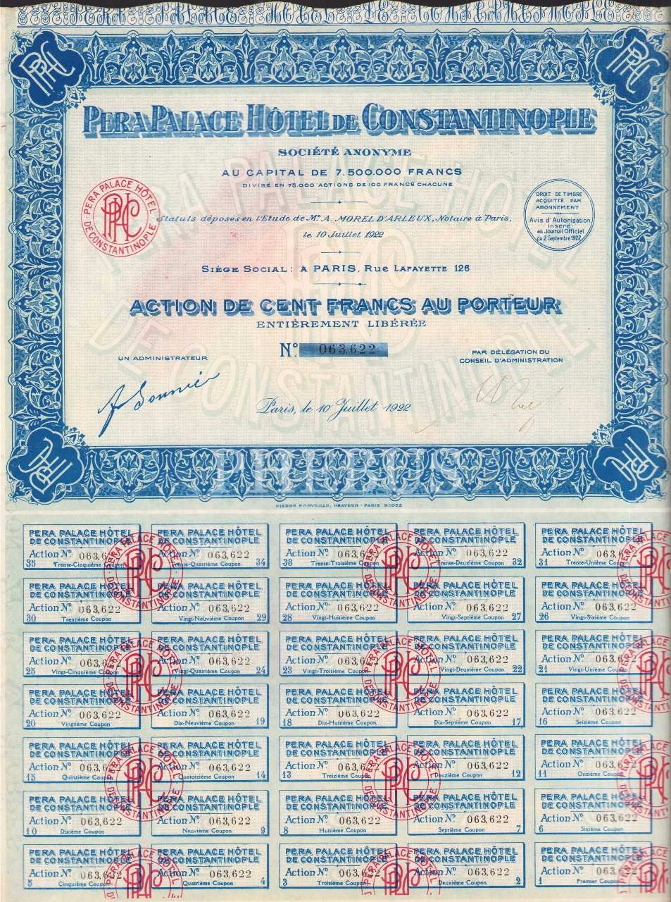 Pera Palace Hotel De Constantinople Anonim Şirketi'ne ait hisse senedi, 31x41 cm, bir kenarı hafif yırtık haliyle