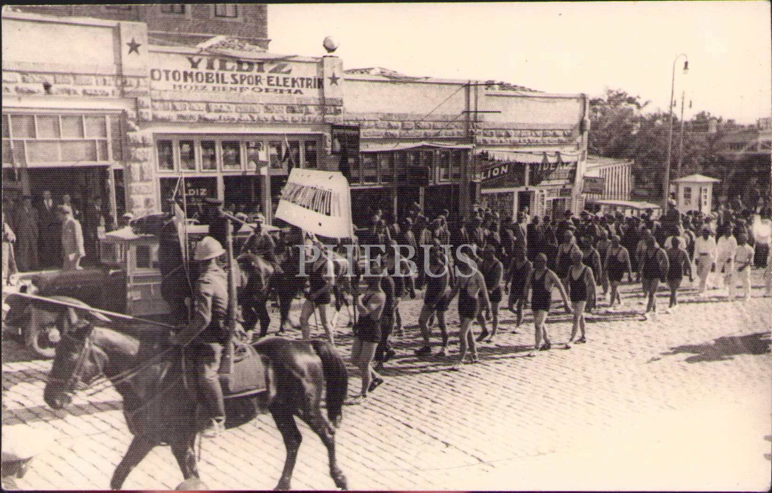 "Yıldız Otomobil-Spor-Elektrik" tabelasının görüldüğü çarşıda yürüyüş yapan güreşçiler