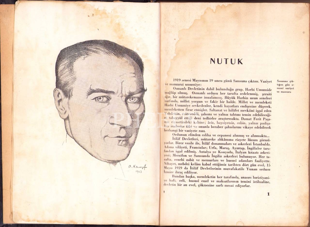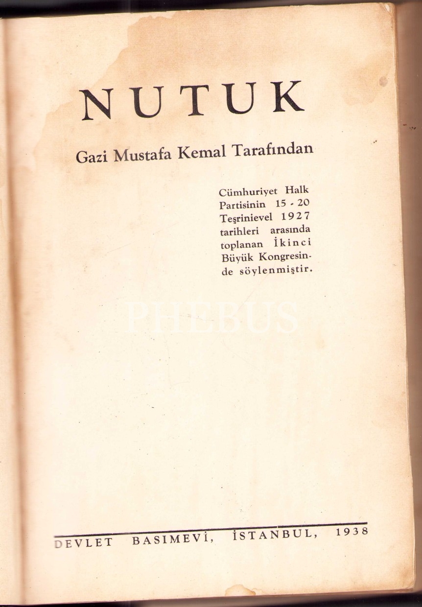 NUTUK, Gazi Mustafa Kemal, harita ekiyle, Devlet Basımevi, İstanbul 1938, 658 s., 18x24 cm, cilt kapağı kısmen ayrık haliyle