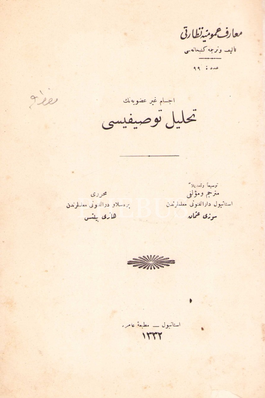 Osmanlıca ECSAM-I GAYRİ UZVİYENİN TAHLİL-İ TAVSİFÎSİ, Heinrich Biltz, çev. Sûzi Osman, Amire Matbaası, İstanbul 1332, 306 s., 16x24 cm, cildi hafif yıpranmış haliyle
