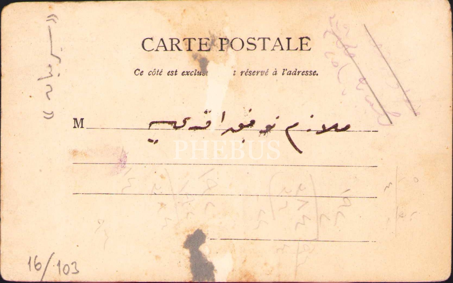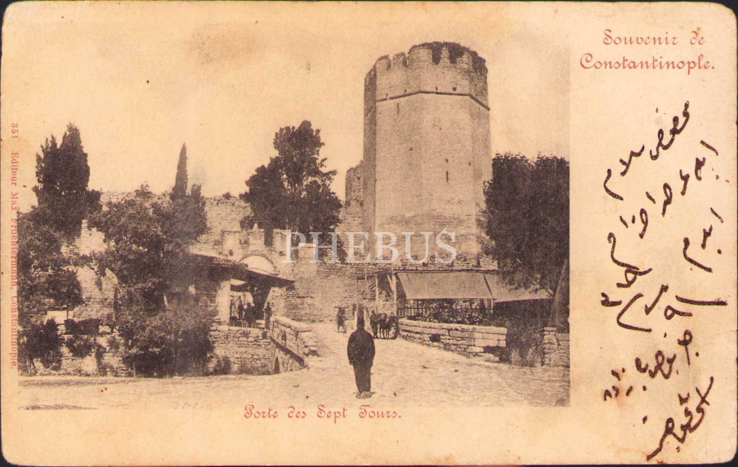 Mülazım Tevfik Efendi'ye Yedikule görselli kartta "Mahsus selam ile arz-ı ihtiram", ed. Max Fruchtermann, Constantinople, 1318 tarihli, yorgun haliyle