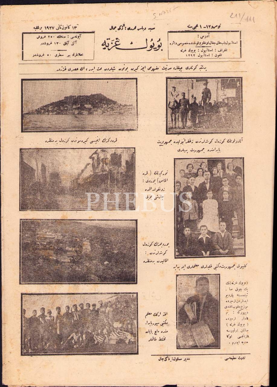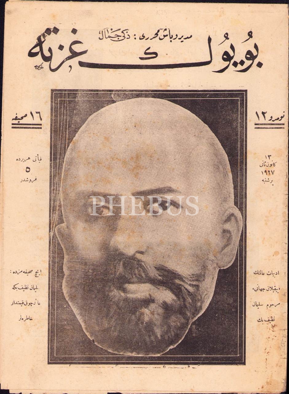 Osmanlıca Büyük Gazete'nin 12. sayısı, 13 Kanunusani 1927, Süleyman Nazif Bey'e ait ön kapak görseliyle, 25x34 cm, hafif yıpranmış haliyle