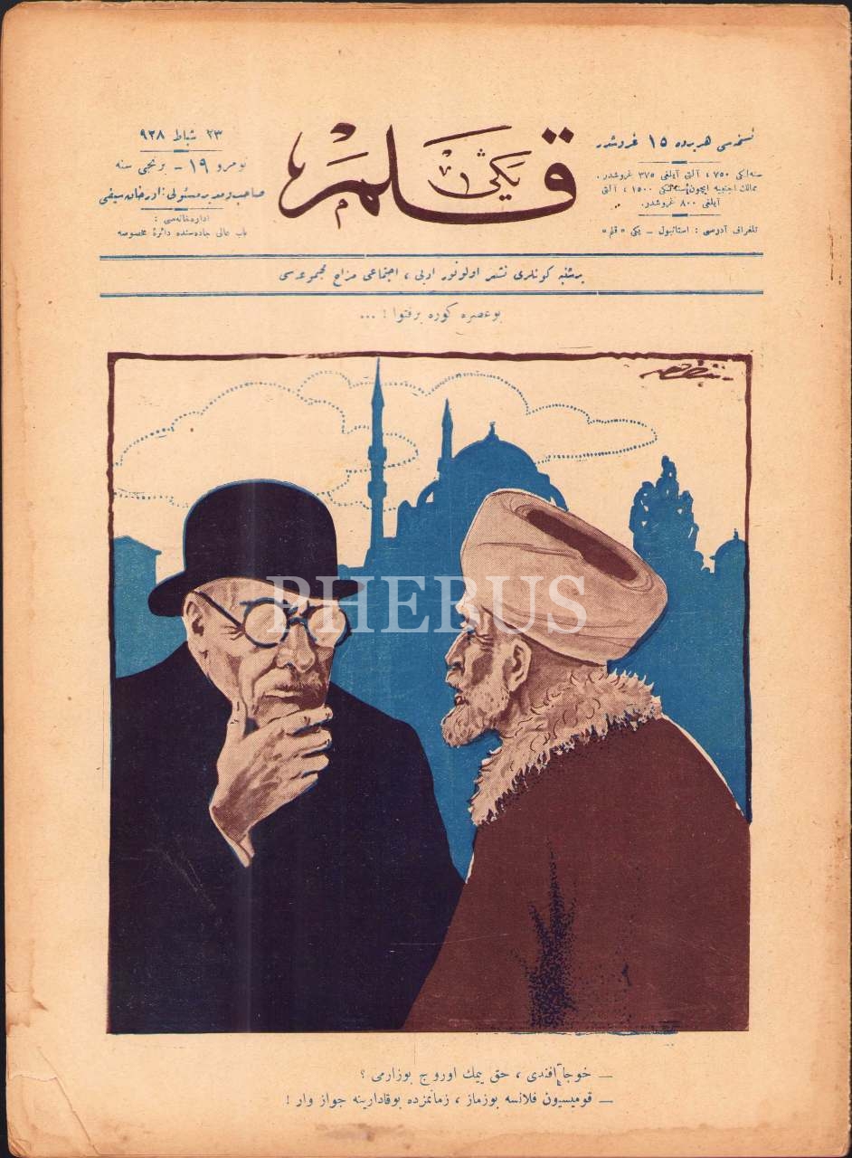 Osmanlıca Yeni Kalem dergisinin 19. sayısı, 23 Şubat 1928, "Bu asra göre bir fetva!..." başlıklı ön kapak görseliyle, 23x31 cm, kapağı hafif yıpranmış haliyle