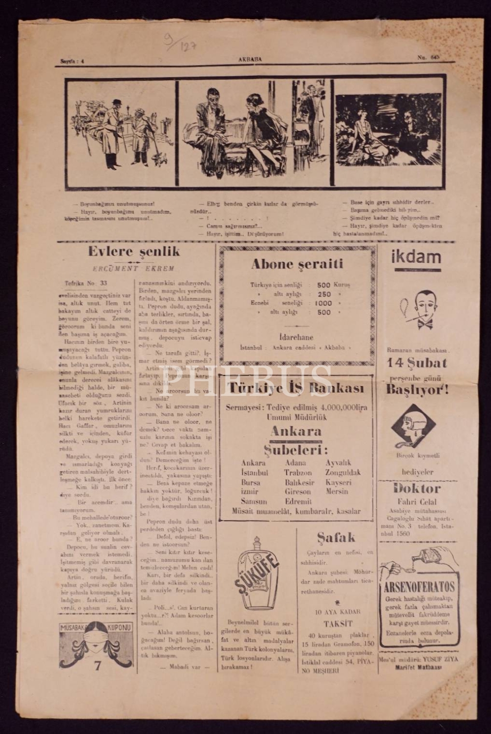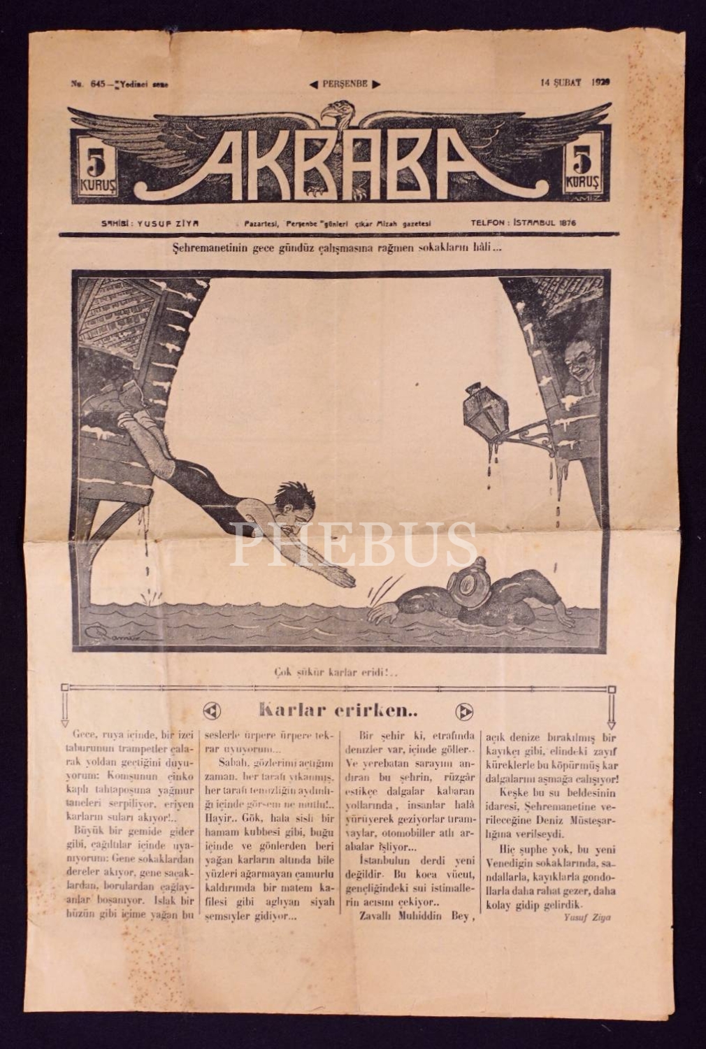 Mizah gazetesi Akbaba'nın 645. sayısı, 14 Şubat 1929, "Şehremanetinin gece gündüz çalışmasına rağmen sokakların hâli…" başlıklı ön kapak görseliyle, 31x47 cm, hafif yıpranmış haliyle