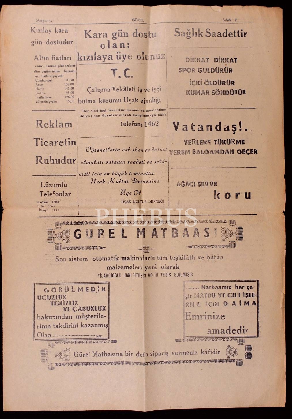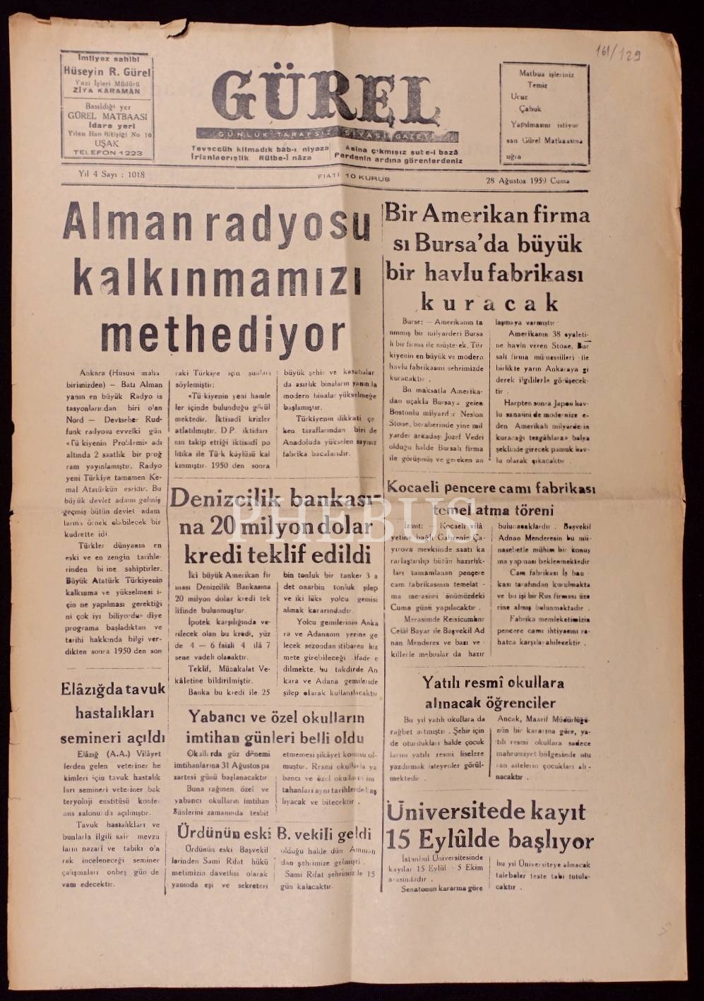 "Tarafsız Siyasi Gazete" Gürel'in 1018. sayısı, 28 Ağustos 1959, tek sayfa, 35x50 cm, kenarları hafif yırtık haliyle