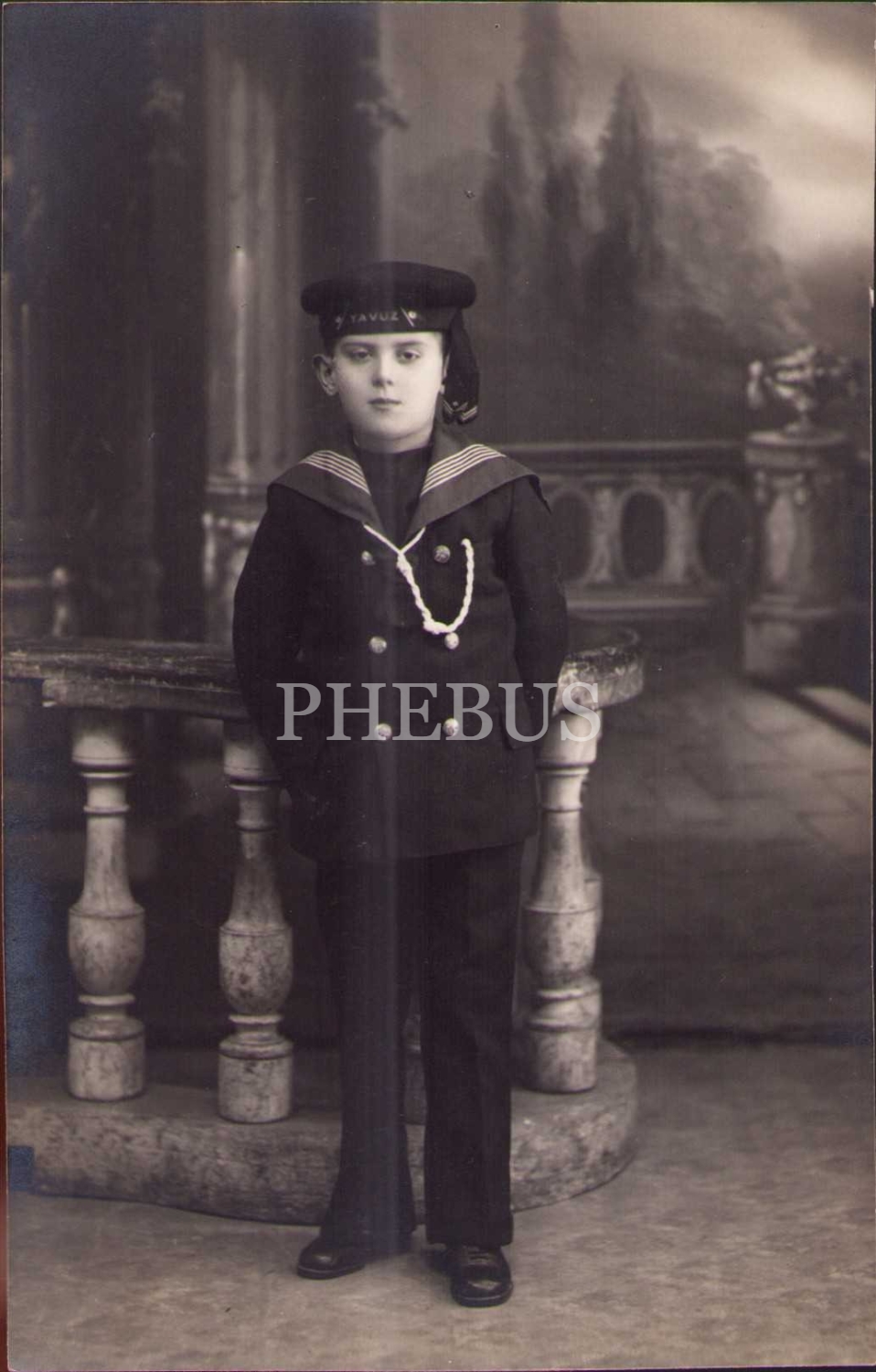 "Yavuz" yazılı şapkasıyla poz veren küçük bahriyeli, 1929 tarihli Osmanlıca açıklamalı, Turan Fotoğrafhaneleri-Divanyolu/İstanbul