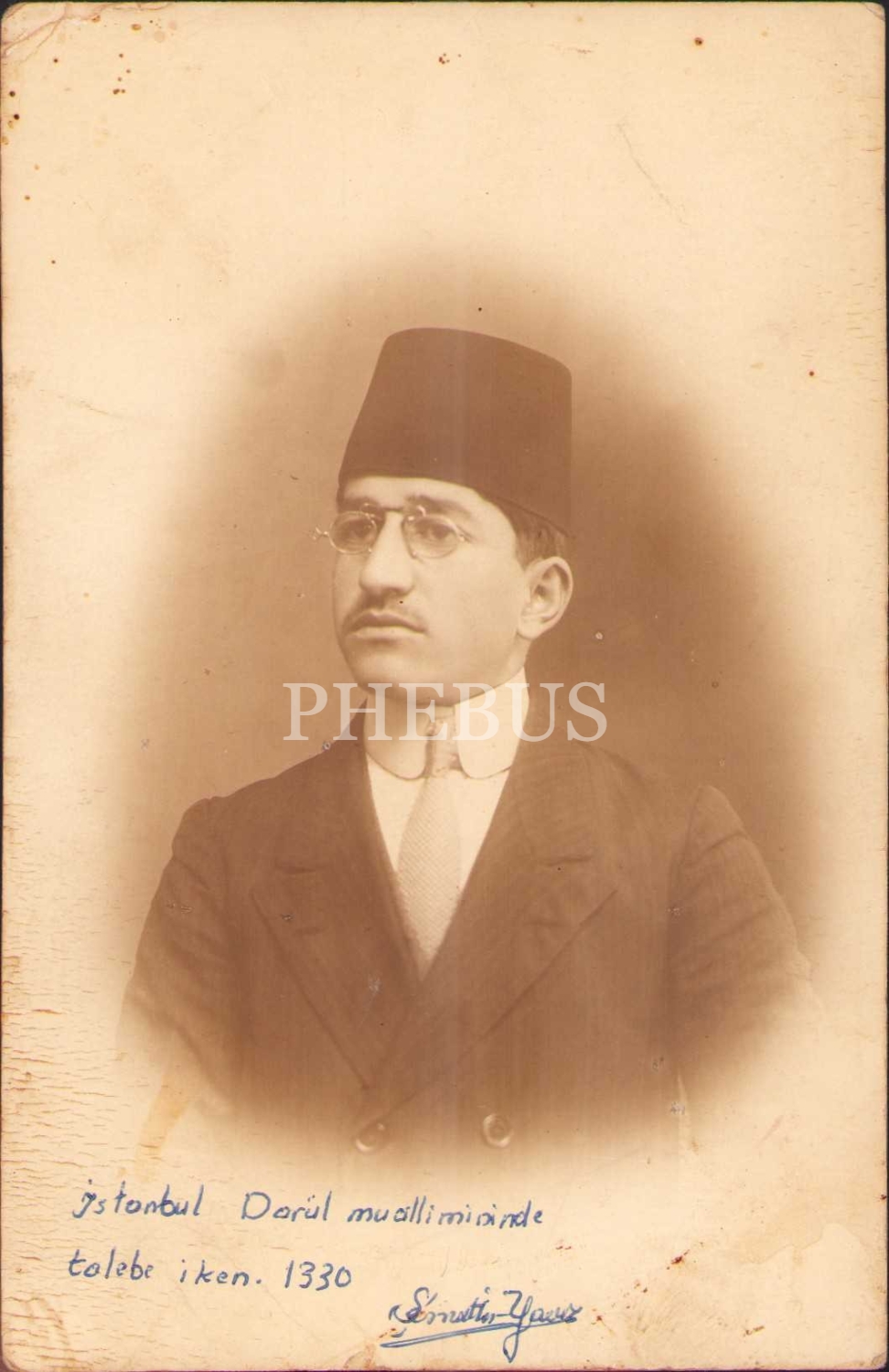 İstanbul Darulmualimin öğrencisinin 1330 tarihli hatıra fotoğrafı, Resne Fotoğrafhanesi, hafif yıpranmış haliyle