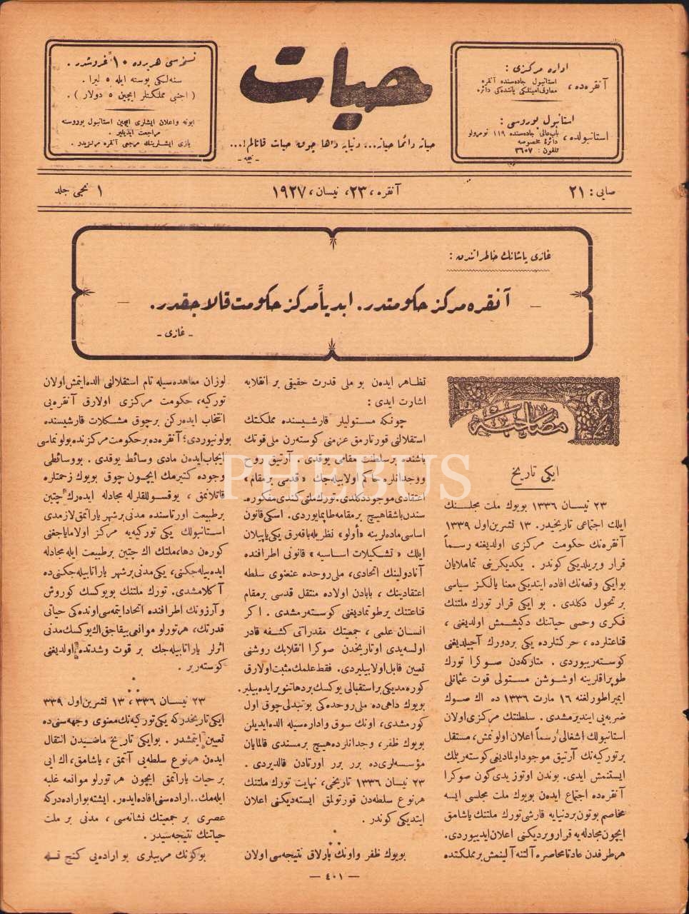 Osmanlıca Hayat dergisinin 21. sayısı, 23 Nisan 1927, Gazi'ye ait "Ankara merkez hükümetdir. Ebediyen merkez hükümet kalacakdır" ön kapak başlığıyla, 24x32 cm