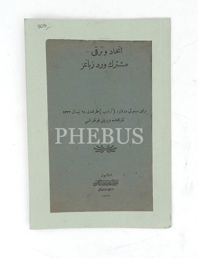 Osmanlıca-Almanca İTTİHAD VE TERAKKİ- MÜŞTEREK VİRD-İ ZEBANIMIZ, Berlin Mebusu Dr. Traub, Ahmed İhsan ve Şürekası Matbaası, İstanbul/Konstantinopel 1917, 20 s., 16x23 cm