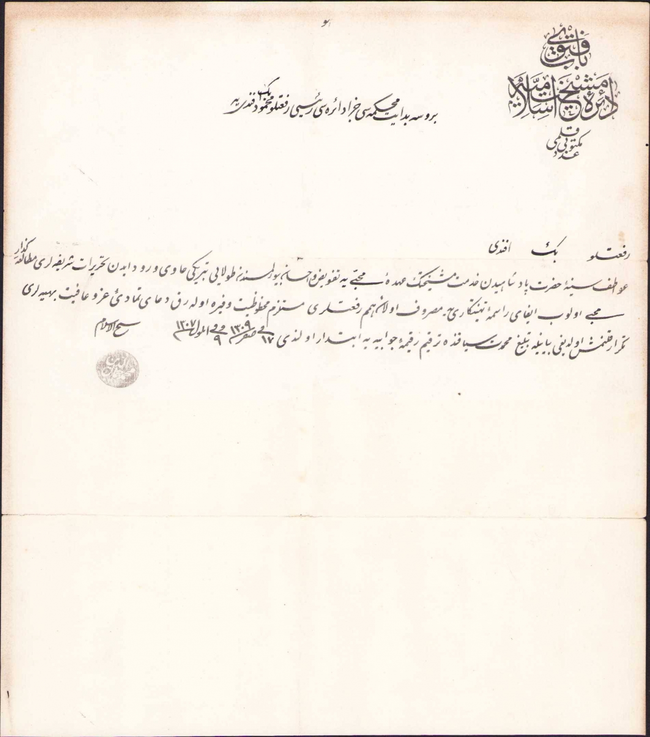 Osmanlı Bidayet mahkemesi ceza reisi Mahmud Bey’e yazılan resmi yazı, 24x27cm