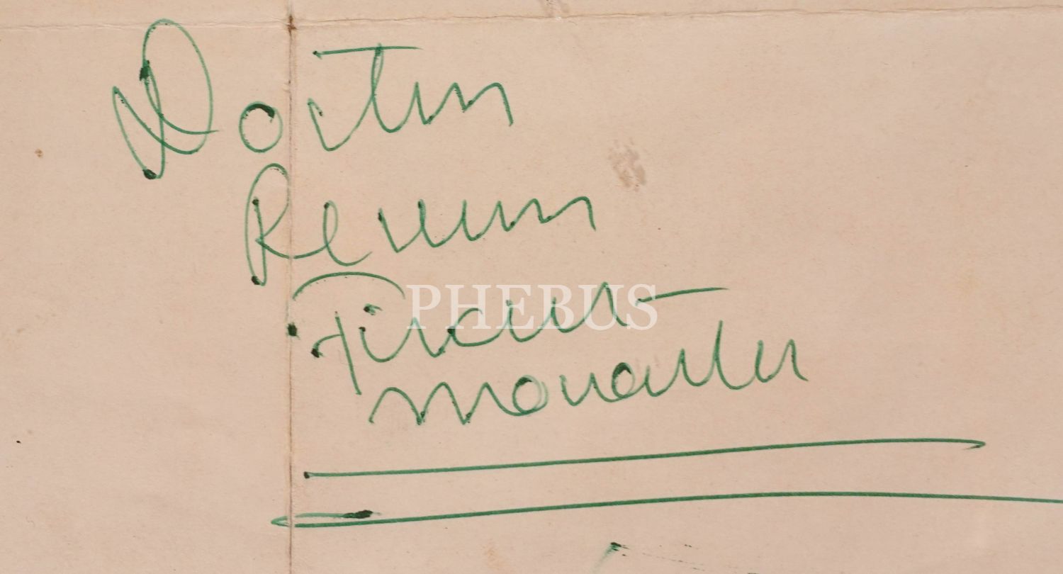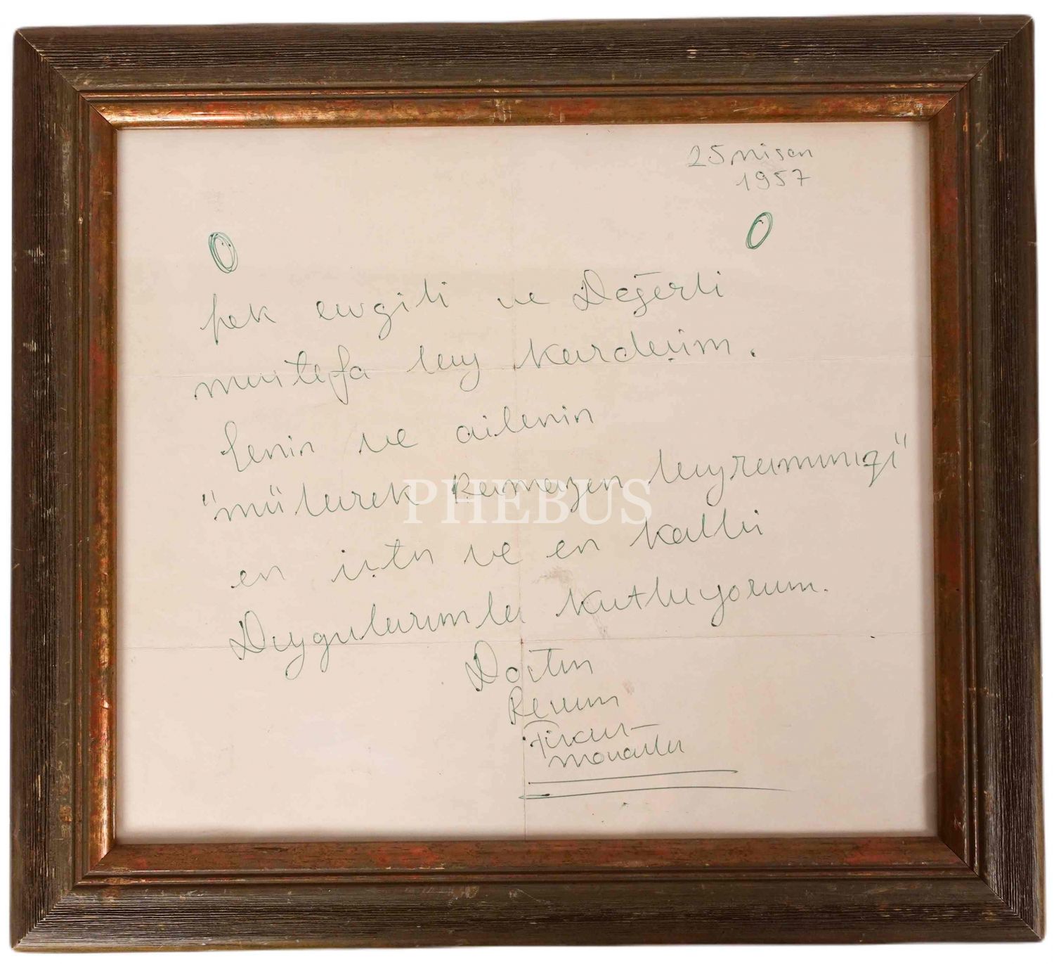 Fikret Mualla (1903 – 1967), hiçbir akımdan etkilenmeyen, hiç kimseye benzemeyen özgün tarzıyla olduğu kadar; parasızlık, ilgisizlik ve sıkıntılarla geçen, zaman zaman yolu akıl hastanesine uğrayan çalkantılı ve bohem yaşamıyla da efsaneleşen bir ressamdı. Müzayedeye sunulan 1957 tarihli mektupta Fikret Mualla, "Mustafa" adlı bir dostunun ve ailesinin "mübarek ramazan bayramı"nı kutluyor. Şık ve zarif, eski çerçeve içinde (Çerçeve boyutları: 35 X 32 cm)…