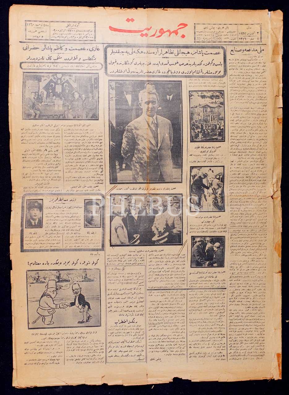 Mustafa Kemal Atatürk ve İsmet İnönü'nün katıldığı seçimlere dair haberlerin yer aldığı 2 Ağustos 1927 tarihli Osmanlıca Cumhuriyet gazetesi, 44x62 cm