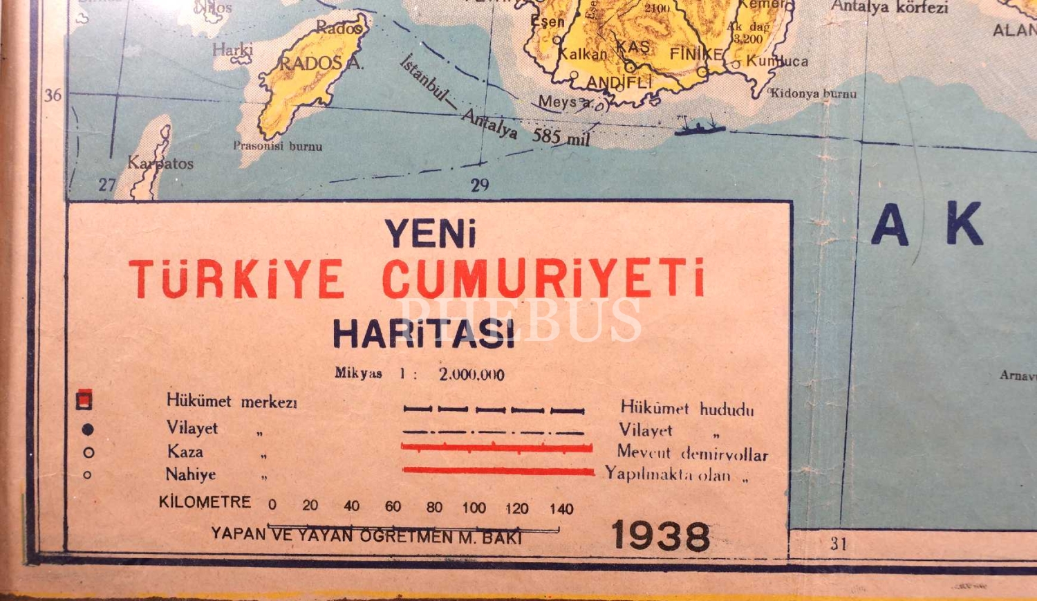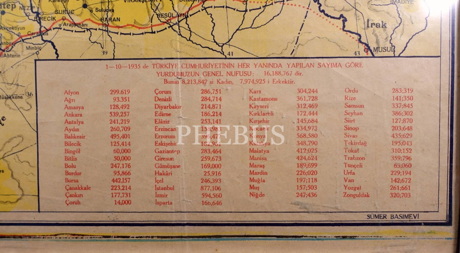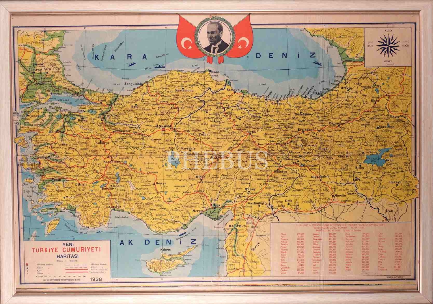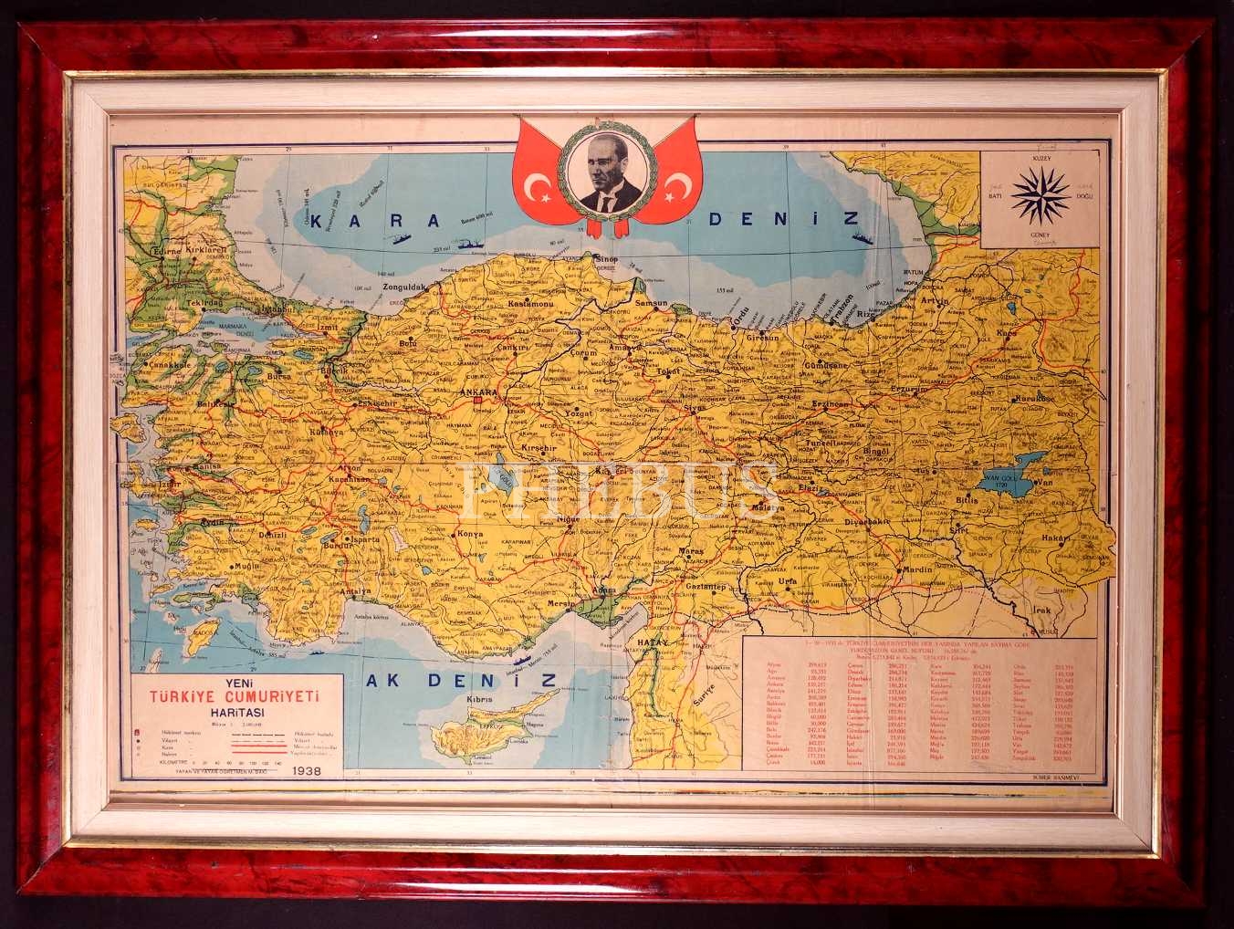 1938 yılına ait Mustafa Kemal Atatürk görselli Yeni Türkiye Cumhuriyeti Haritası, Sümer Basımevi, çerçeve: 70x95 cm