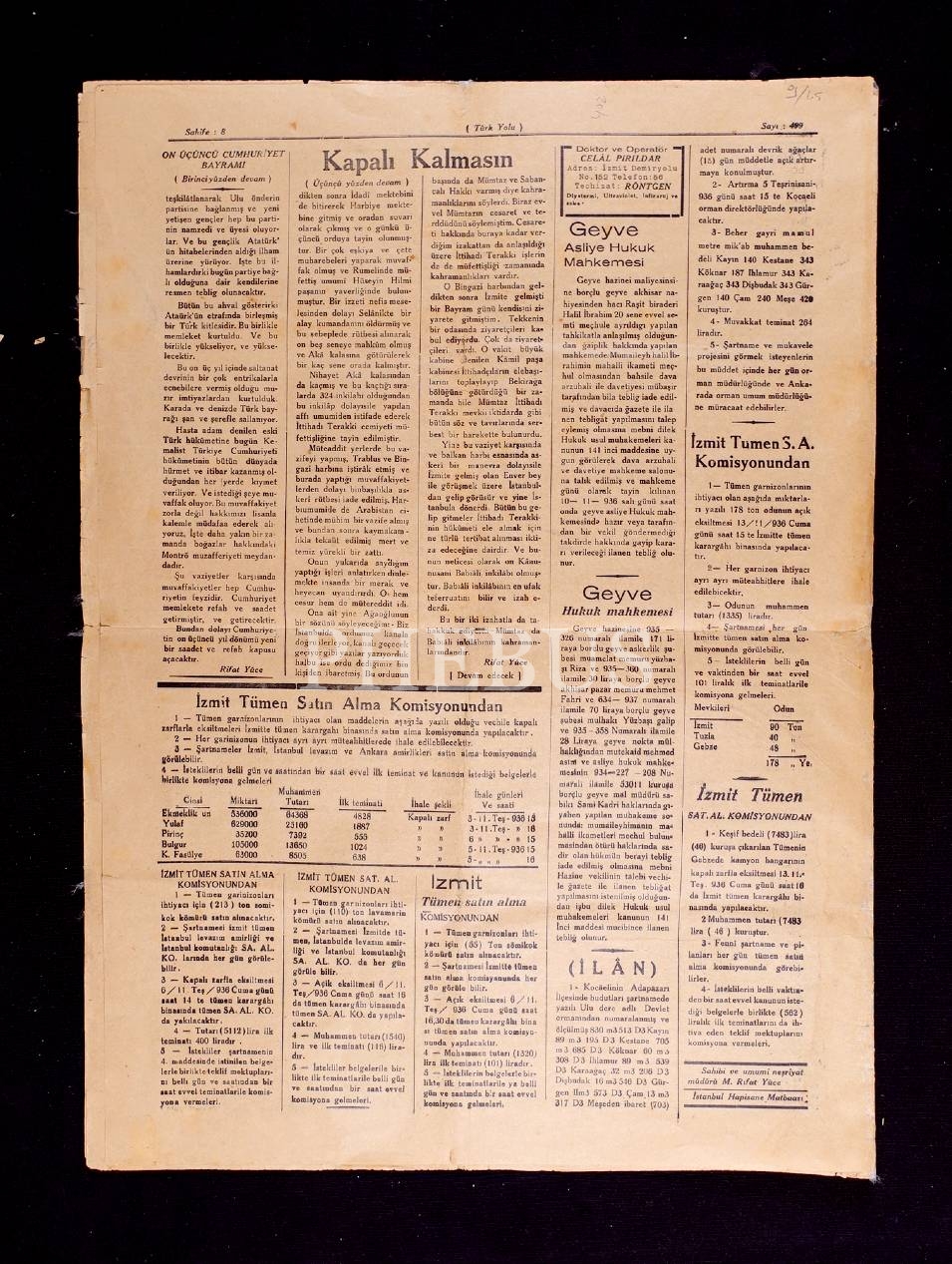 Türk Yolu gazetesinin Mustafa Kemal Atatürk kapaklı ve "Cumhuriyetimiz Onüç Yaşında" manşetli 499. sayısı, 29 Birinciteşrin 1936, 40x56 cm