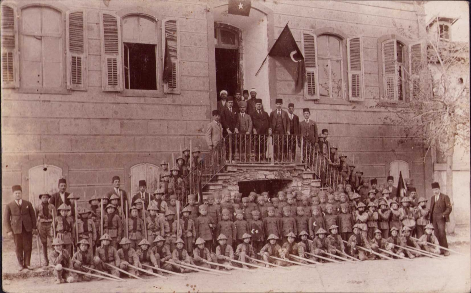Osmanlı mektep önünde öğrenciler, izci takımı ve muallimler, 9x14cm