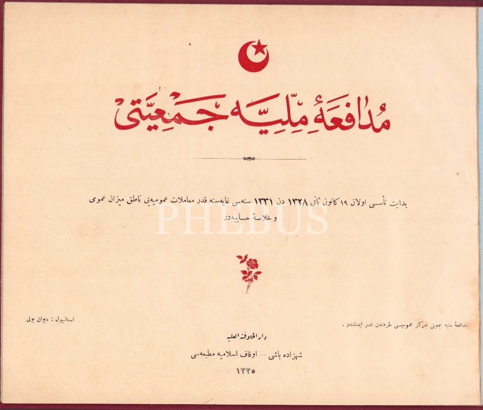 Osmanlıca Müdafaa-i Milliye Cemiyeti 1328-31 Yılları Bütçe ve Hesap Özeti, Evkaf-ı İslamiye Matbaası, Darü'l-Hilafeti'l-Aliyye [İstanbul] 1335, 25 s., 24x30 cm