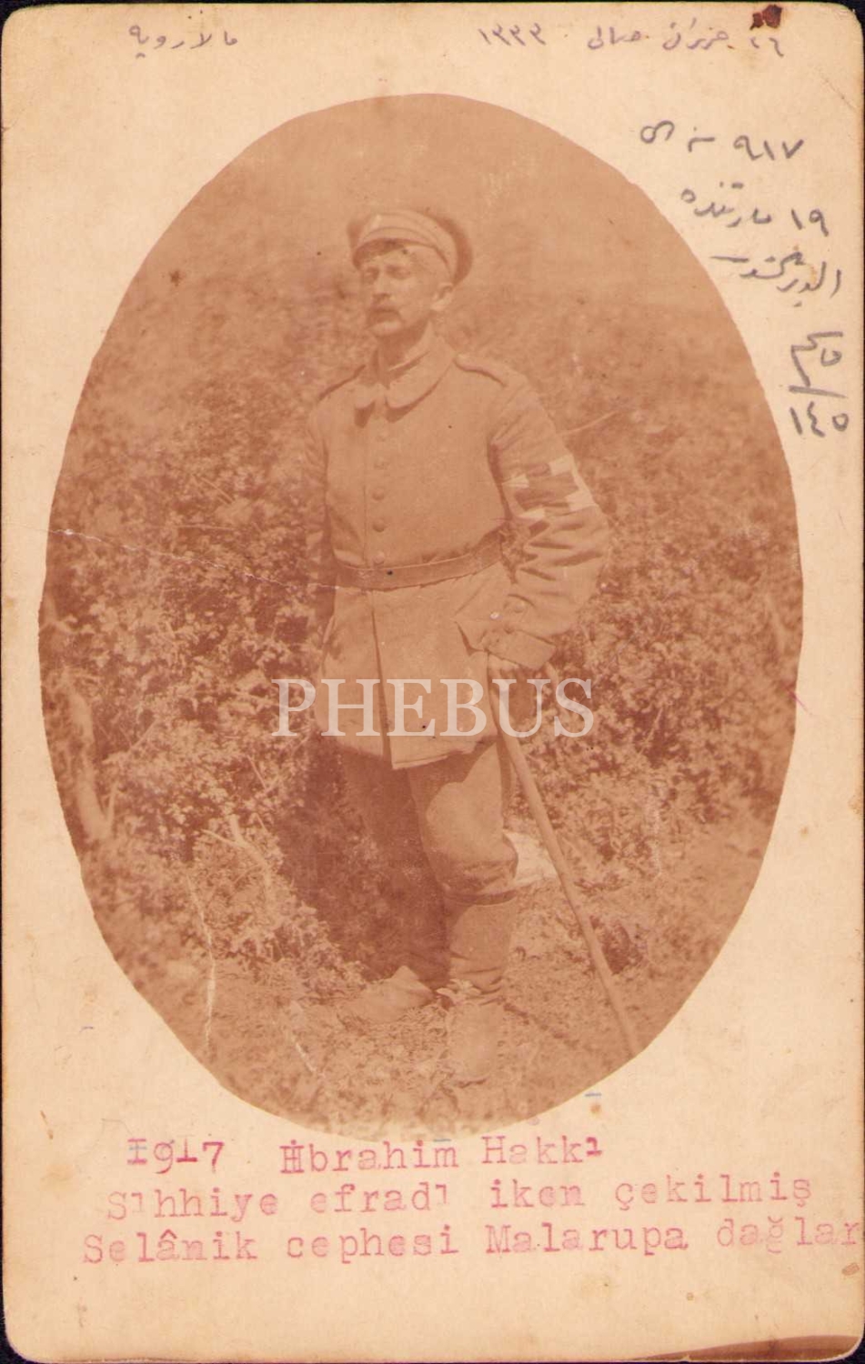 Birinci Cihan Harbi Selanik Cephesi'nde sıhhiye askeri İbrahim Hakkı'nın "917 senesi 19 Mart'ında aldırılmış" hatıra fotoğrafı, ortadan ve üst köşelerden kırık haliyle