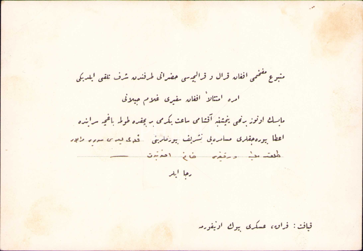 Afgan Büyükelçi Gulam Ceylani'nin Kuleli Lisesi Müdürü Miralay Talat Bey ile eşine gönderdiği Osmanlıca davetiye, 13x18 cm