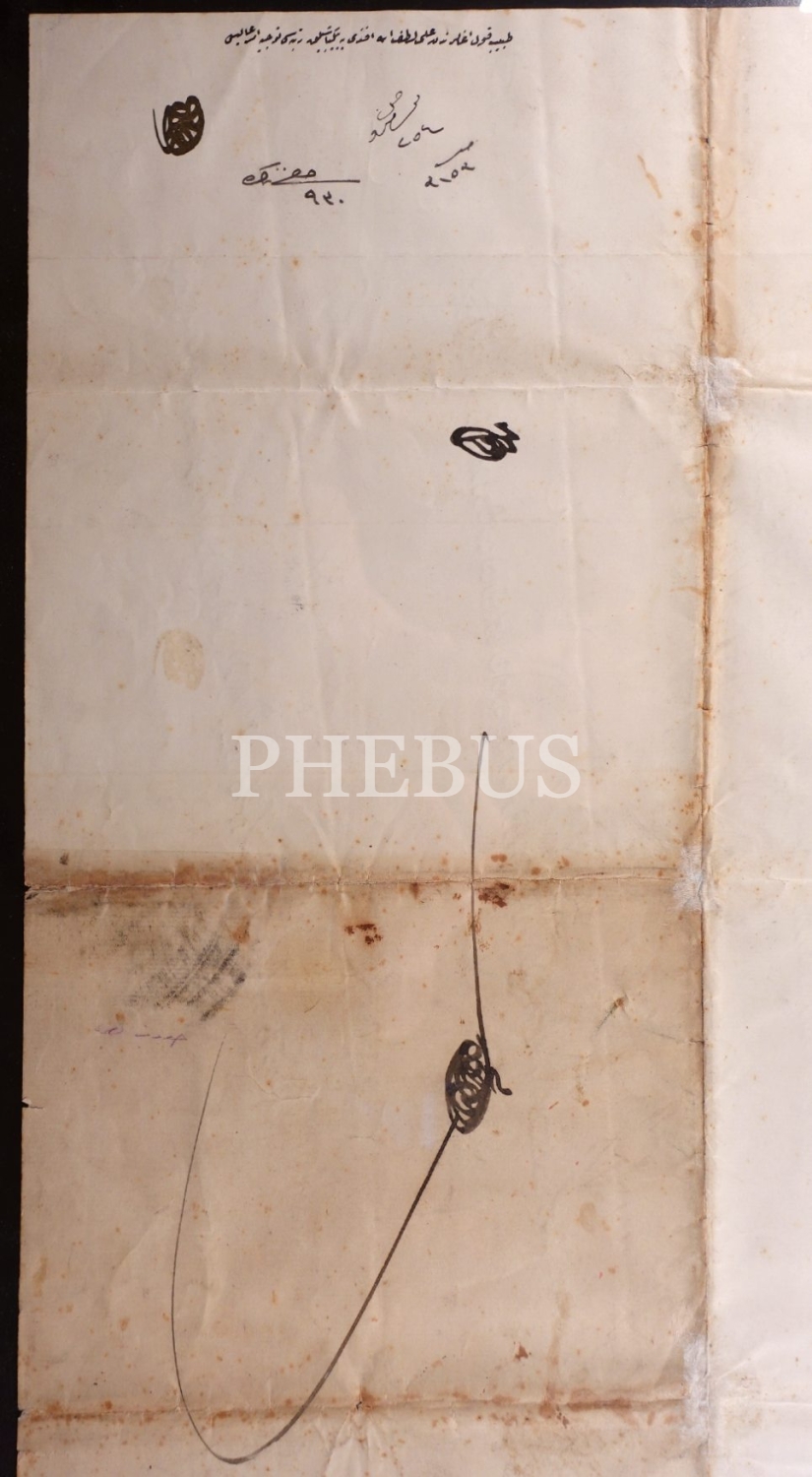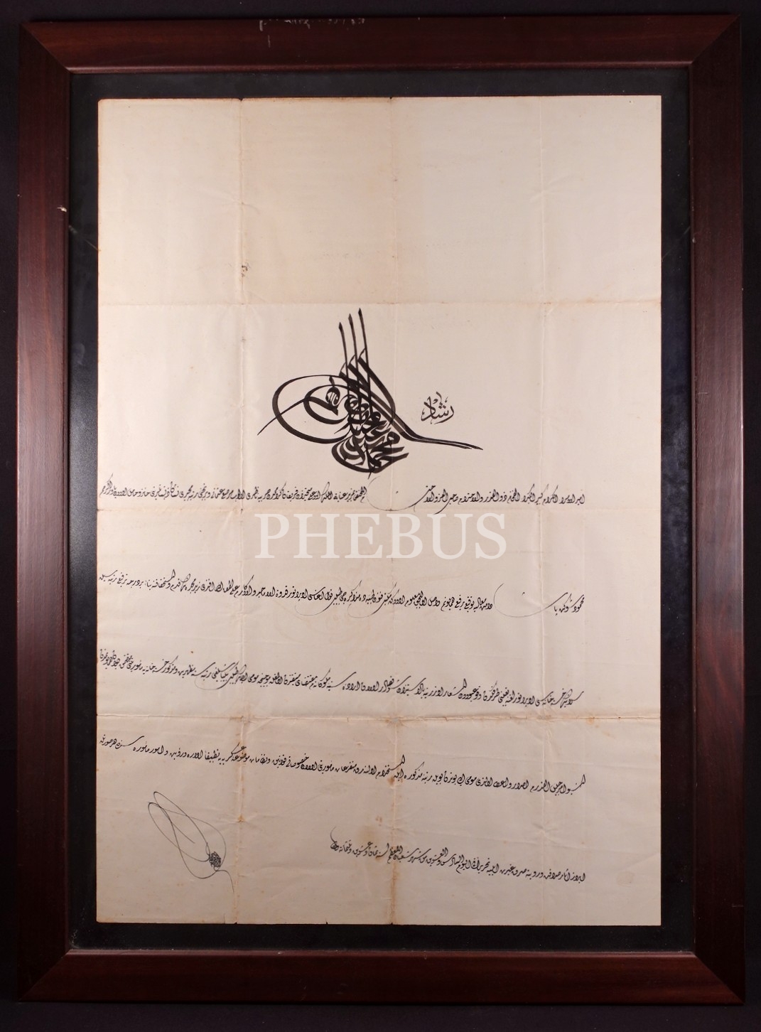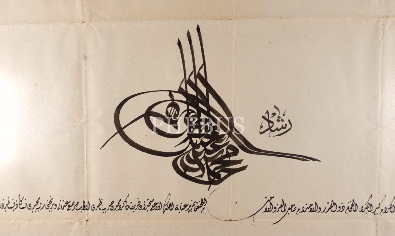 Mekteb-i Fünun-ı Tıbbiye'de Müzakereci Tabib Kolağası Ali Lütfullah Efendi'ye tabib binbaşılığı rütbesi verildiğine dair Sultan Reşad tuğralı ve 1328 tarihli el çekme berat, çerçeve: 73x99 cm