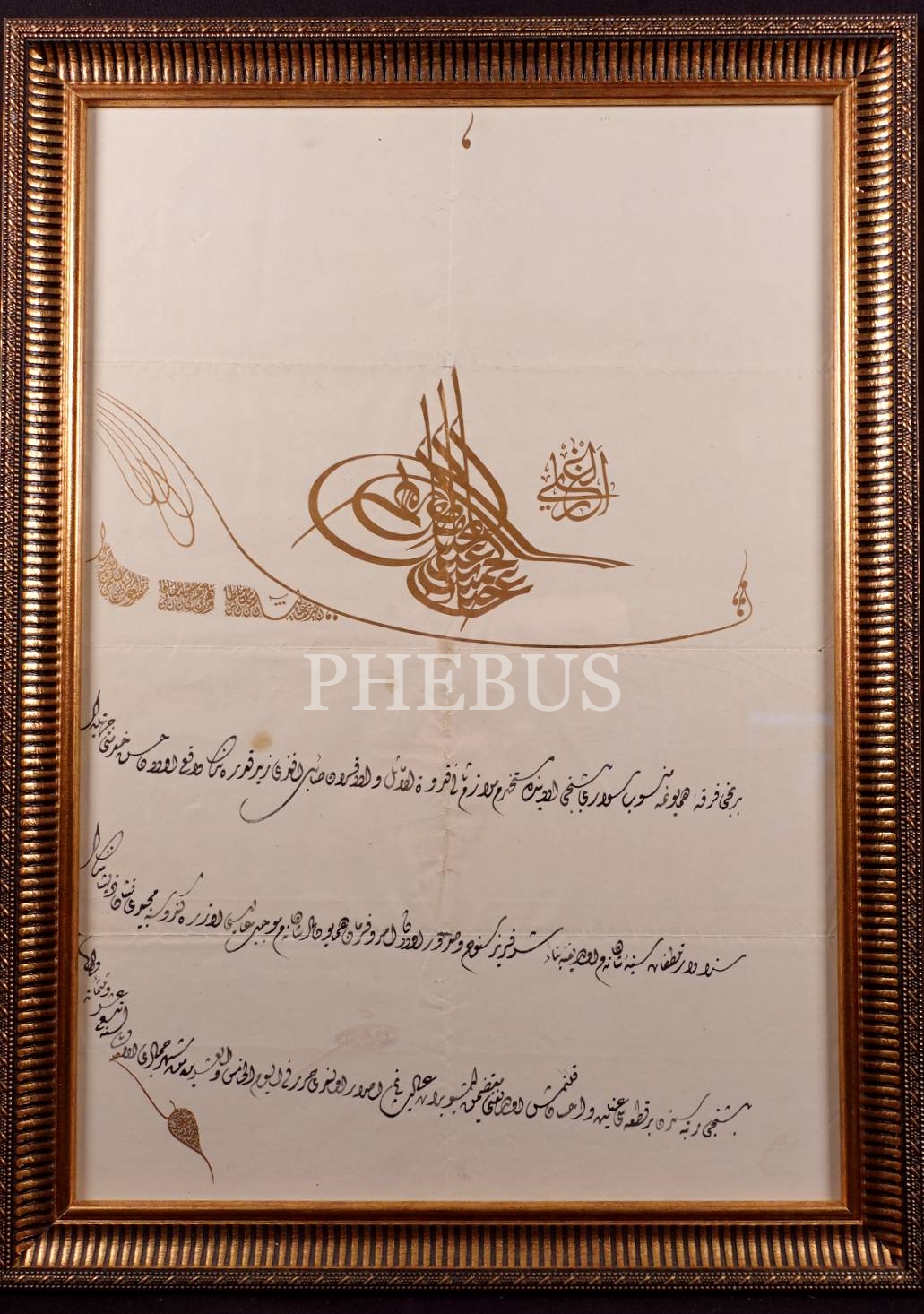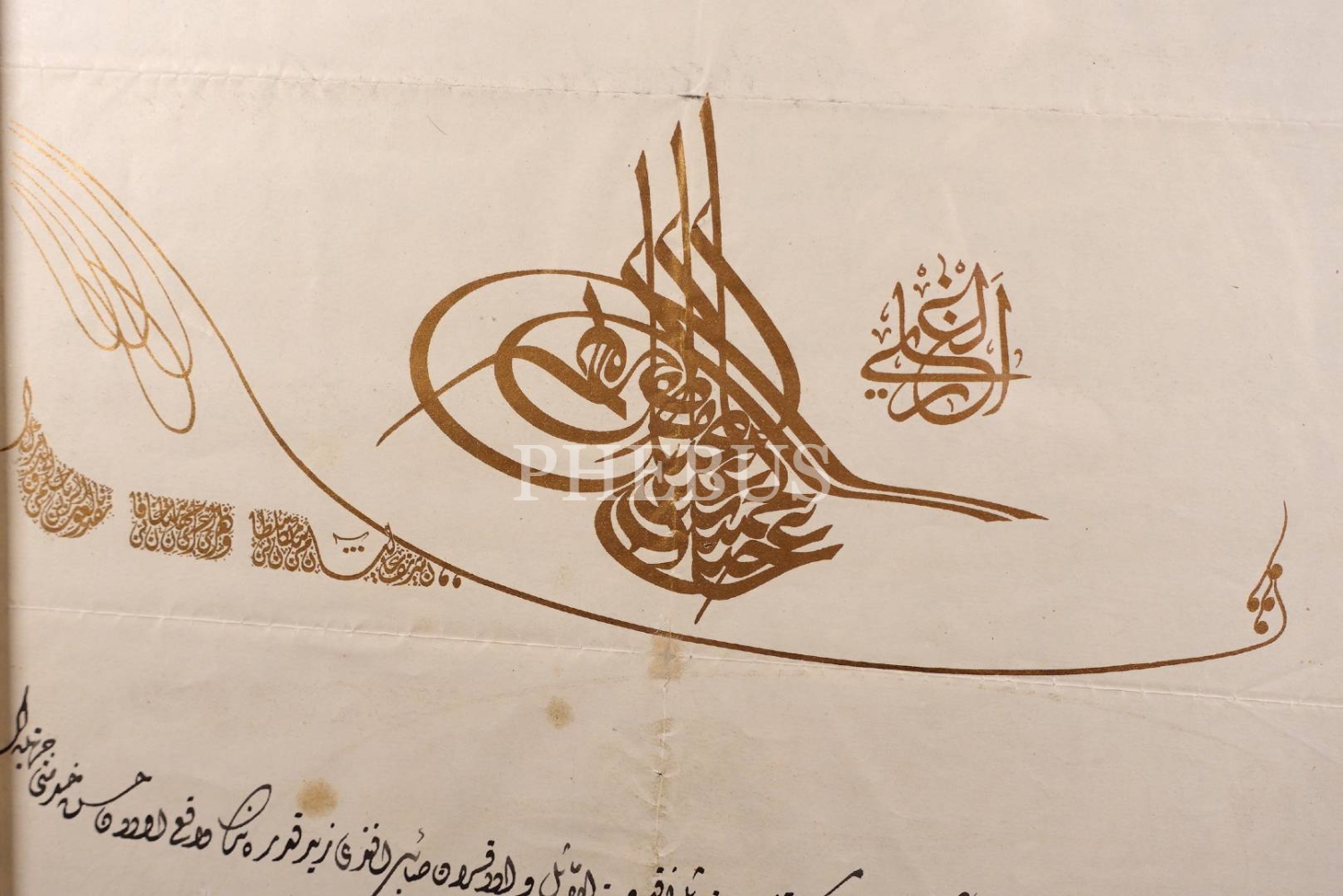 Süvari 5. Alayı'nda Mülazim-i Sani Saib Efendi'ye beşinci derece mecidi nişanı verildiğine dair el-Gazi [2. Abdülhamid] tuğralı ve 1319 tarihli berat, çerçeve: 46x62 cm