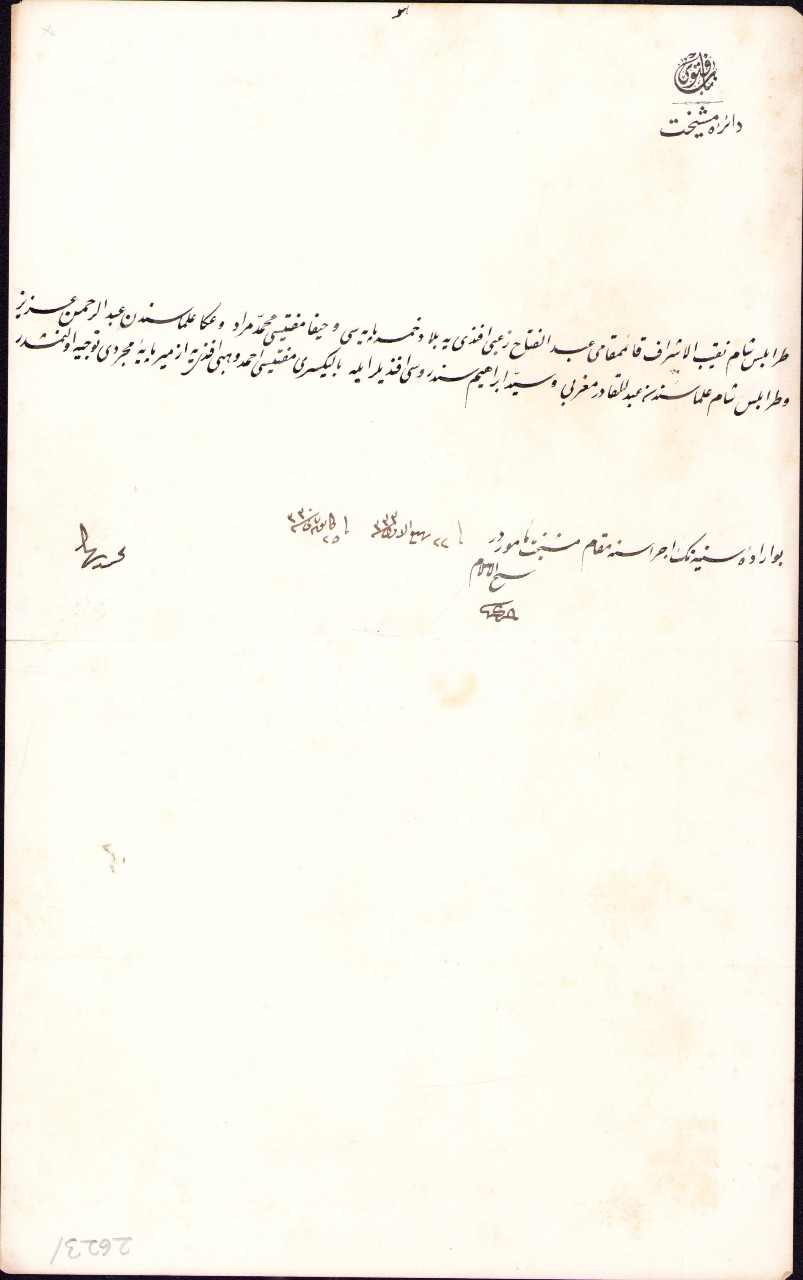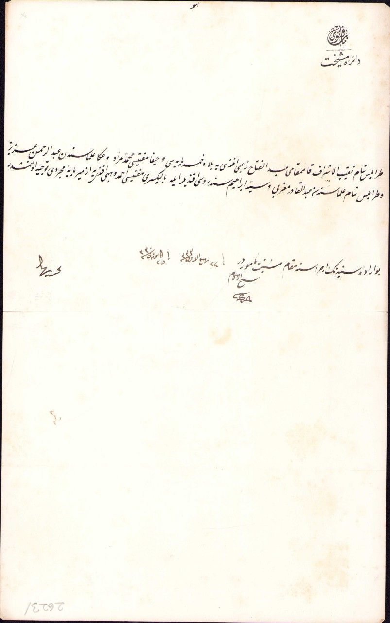 "Trablusşam Nakibü'l-Eşraf Kaimmakamı Abdülfettah Za'bi Efendi'ye bilad-ı hamse payesi Hayfa Müftüsü Mehmed Murad ve Akka ulemasından Abdurrahman Aziz ve Trablusşam ulemasından Abdulkadir Mağribî ve Seyyid İbrahim Senderusî Efendiler ile Balıkesri Müftüsü Ahmed Vehbi Efendi'ye İzmir paye-i mücerredi tevcih olunmuşdur"
