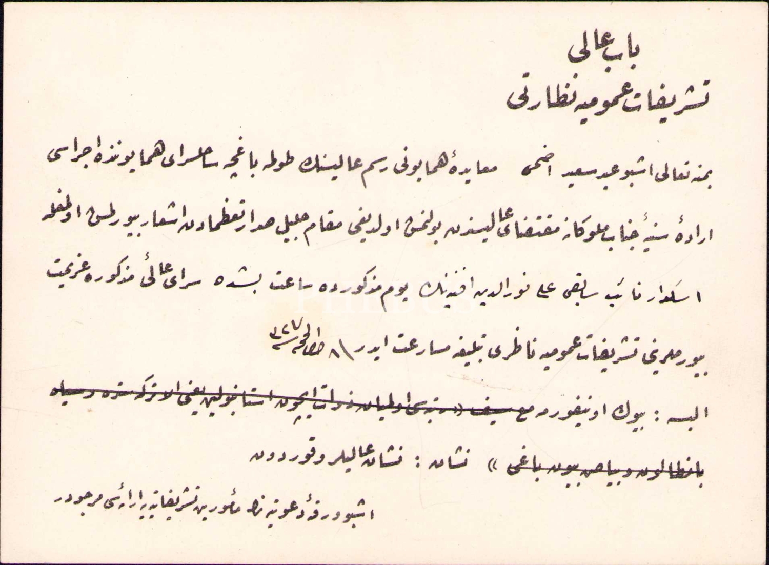 Teşrifat-ı Umumiye Nezareti'nden Üsküdar Naib-i Sabıkı Ali Nureddin Efendi'ye özel 1327 tarihli Osmanlıca bayramlaşma davetiyesi, 12x16 cm