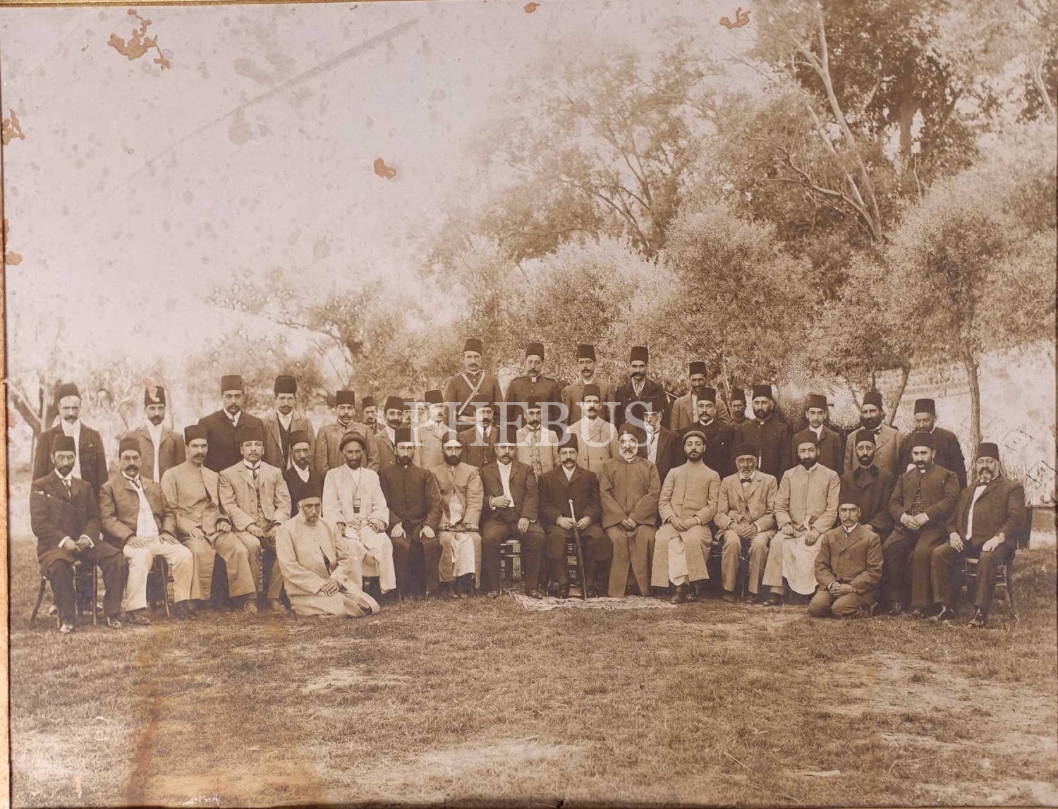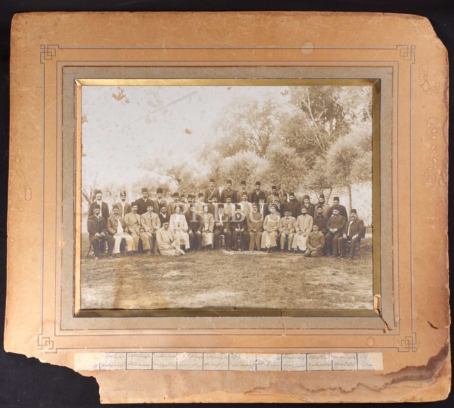 Osmanlı döneminden fesli, kalpaklı ve sarıklı eşrafın yer aldığı büyük boy topluluk hatıra fotoğrafı, paspartusunda Farsça beyitler yer almakta, 62x71 cm