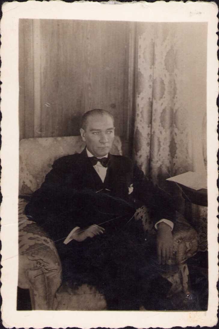 Gazi Mustafa Kemal Atatürk, papyonlu takım elbisesiyle, koltukta otururken, 6x9cm