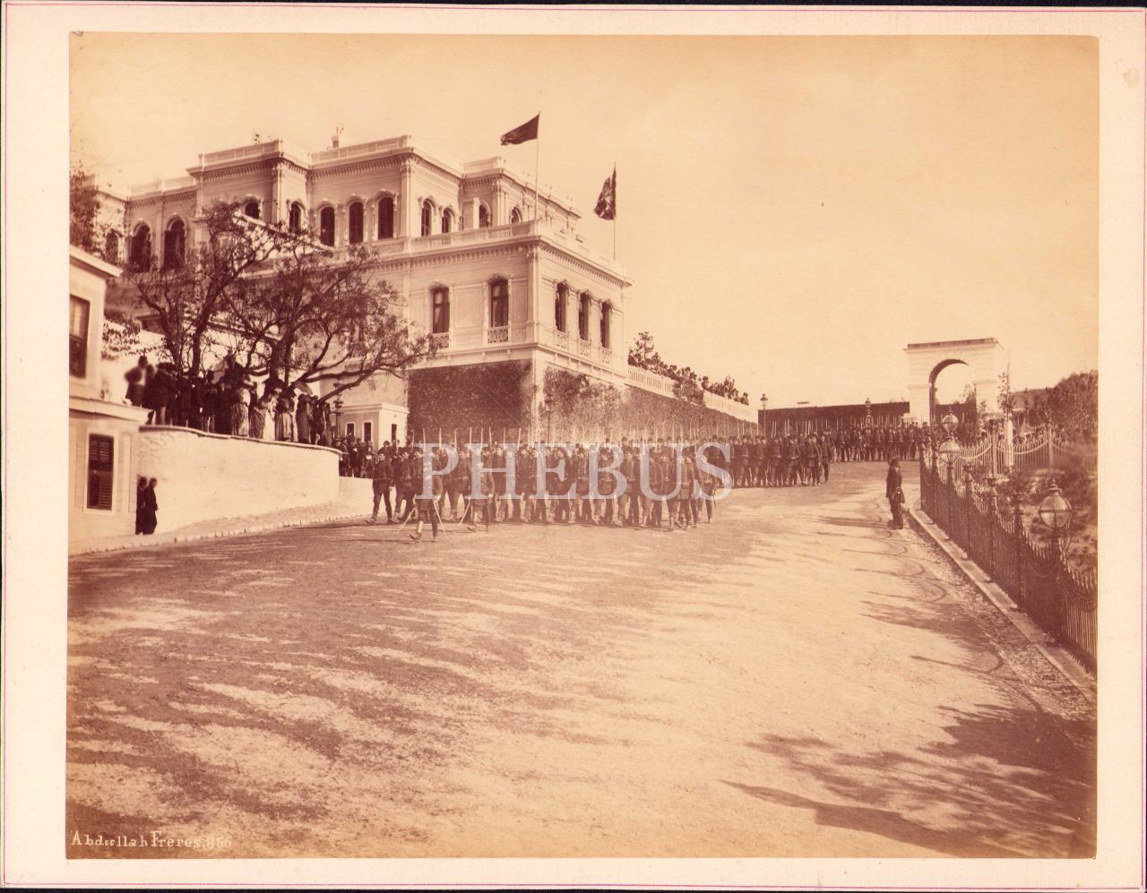Fotoğrafçı Abdullah Biraderler'den cuma selamlığına hazırlanan askerlerin fotoğrafı, kartona yapışık, 21x27 cm