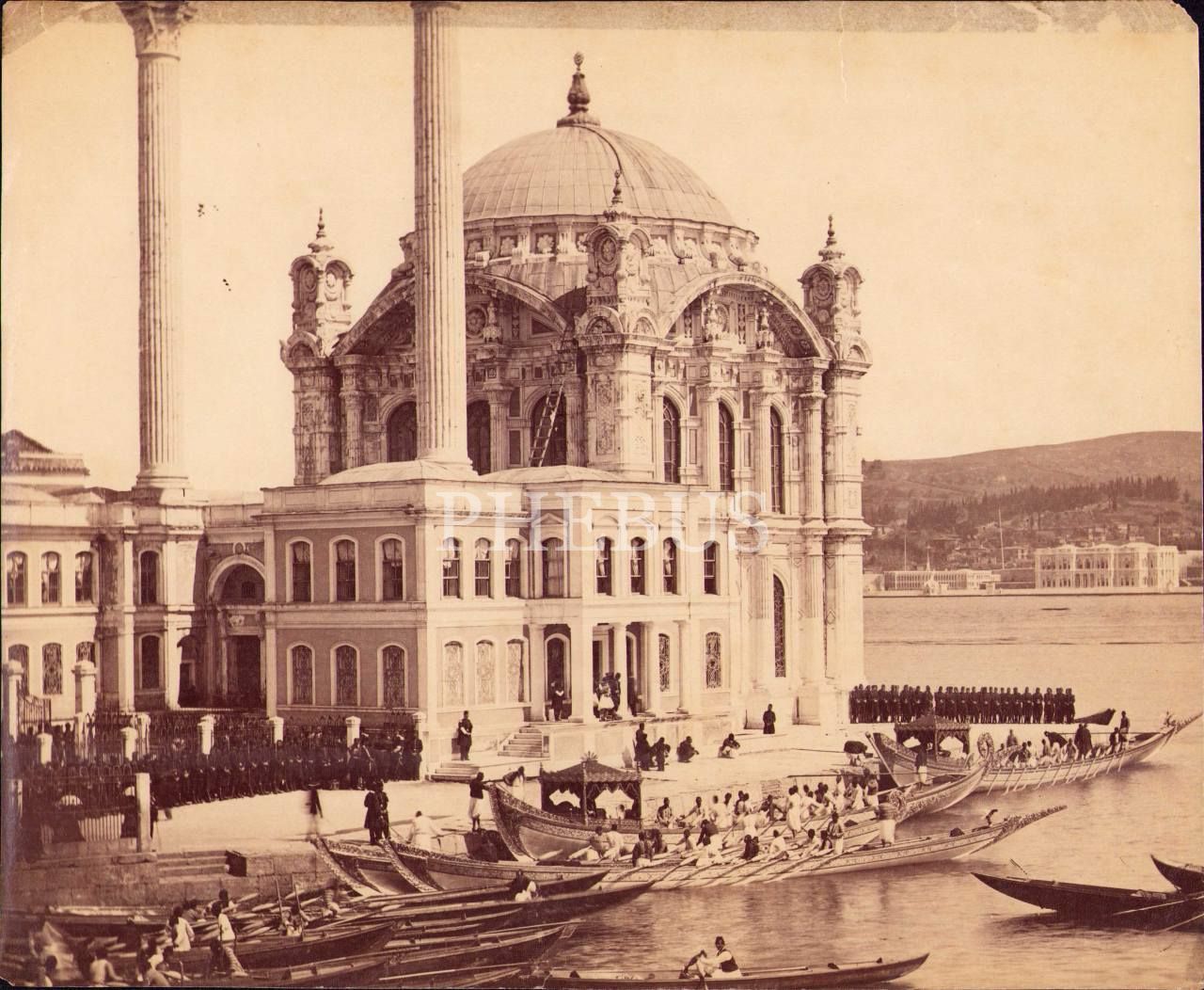Ortaköy Camii'nde padişahı karşılamak için bekleyen askerlere ait albümin fotoğraf, 21x25 cm