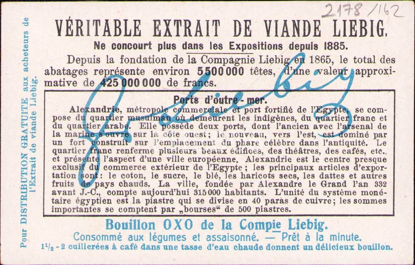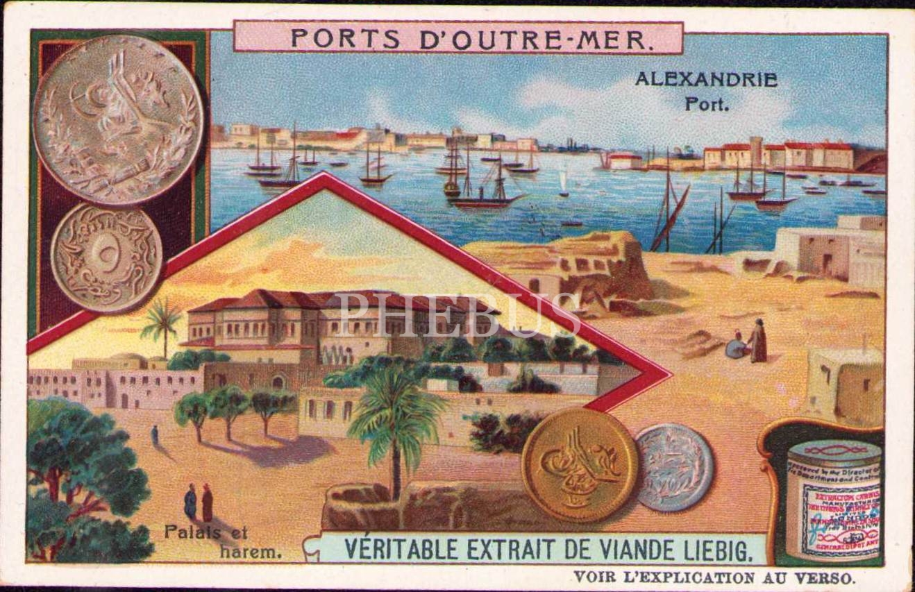 Liebig Et Suyu Şirketi'ne ait ve İskenderiye Limanı ile Saray görselli Fransızca reklam kartı, 7x11 cm
