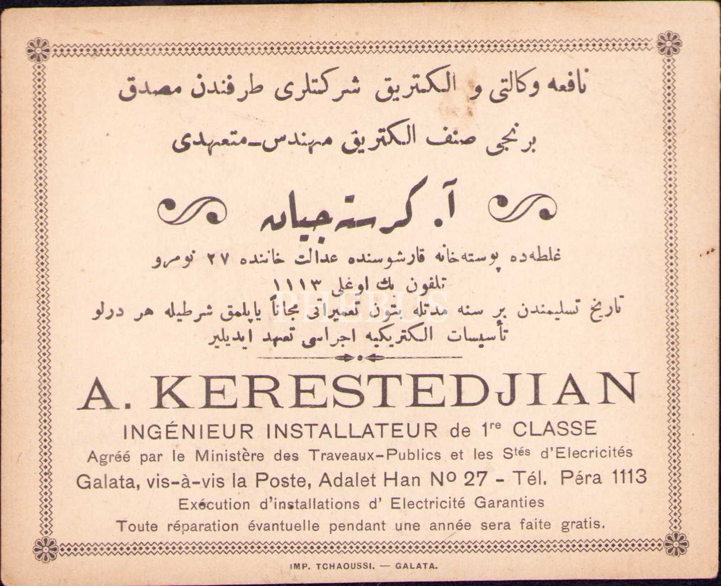 Elektrik Mühendis-Müteahhidi A. Keresteciyan'a ait Osmanlıca-Fransızca reklam kartı, 10x12 cm