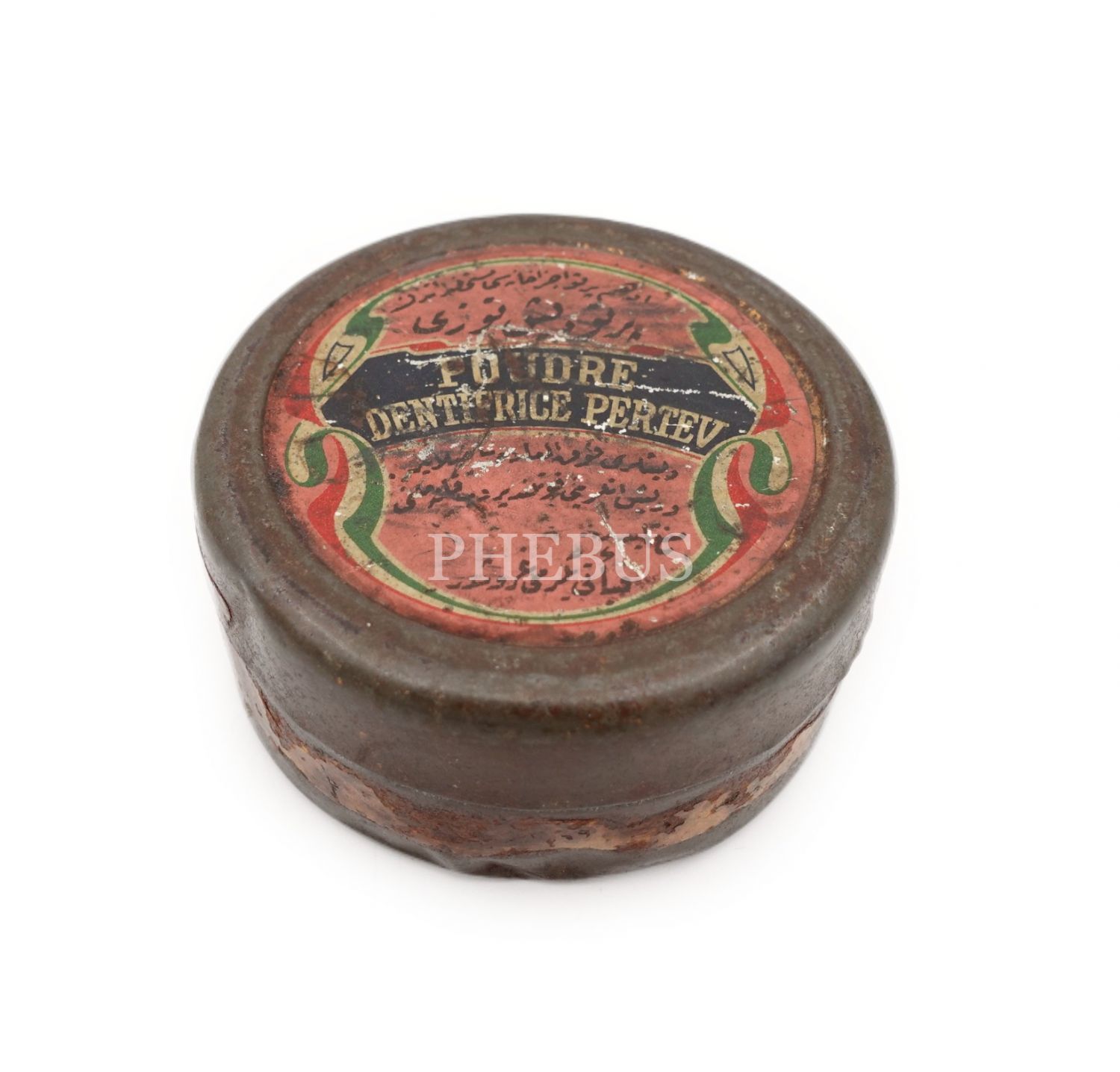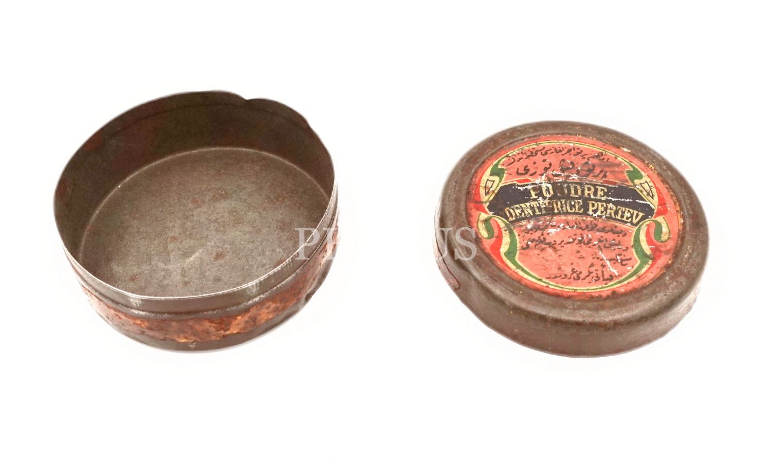 Edhem Pertev Eczahanesi Müstahzaratı'ndan Pertev Diş Tozu'na ait Osmanlıca-Fransızca yazılı teneke kutu, 3x7 cm