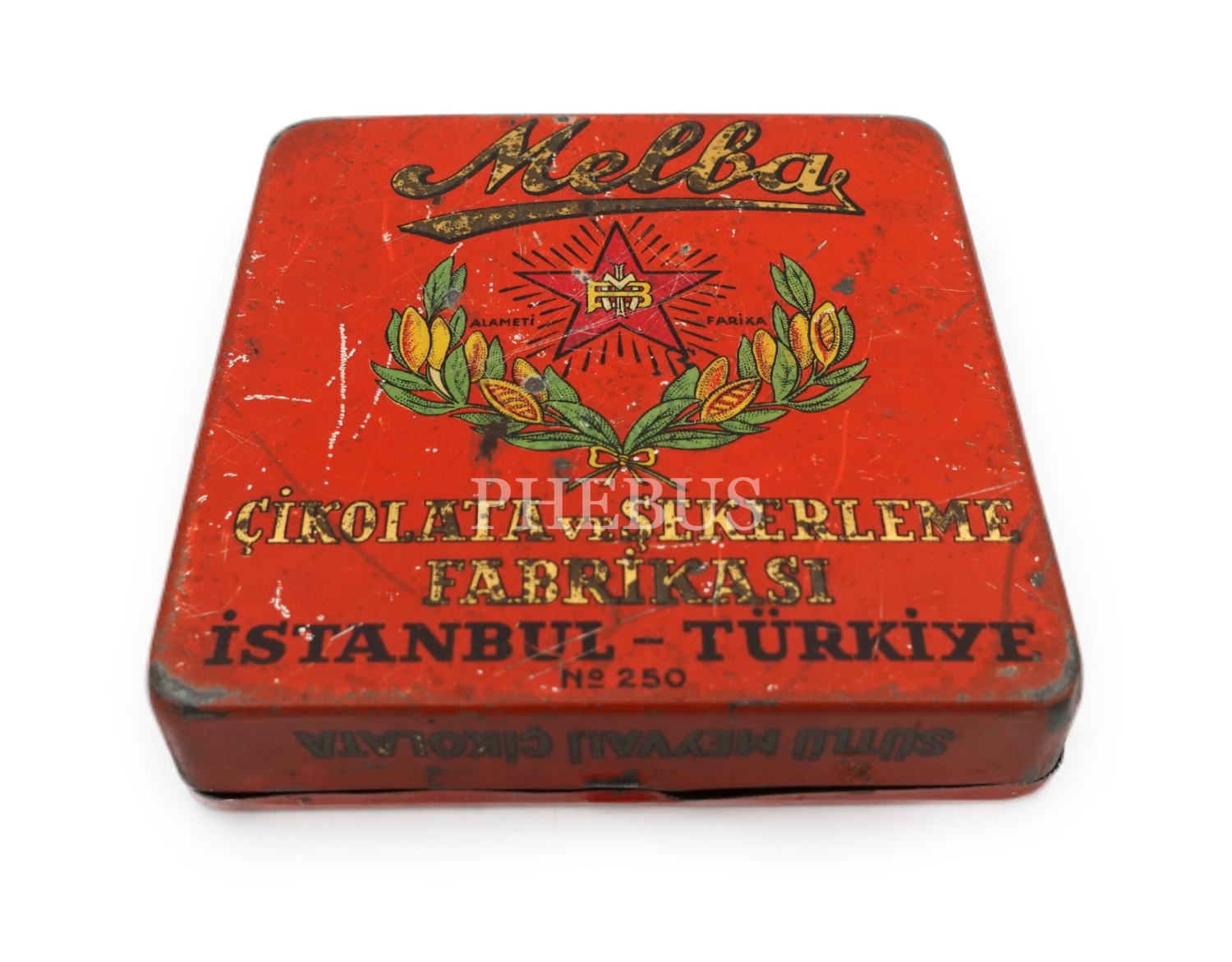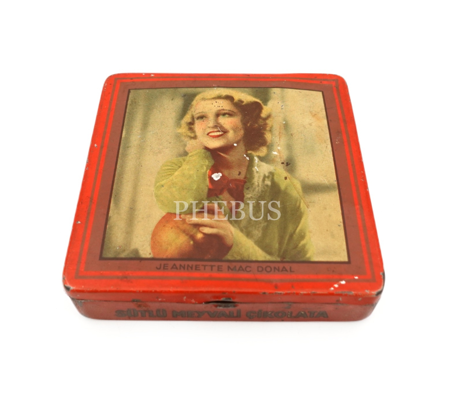 Melba Çikolata ve Şeker Fabrikası'na ait ve Jeannette MacDonald görselli teneke kutu, İstanbul, 2x9 cm