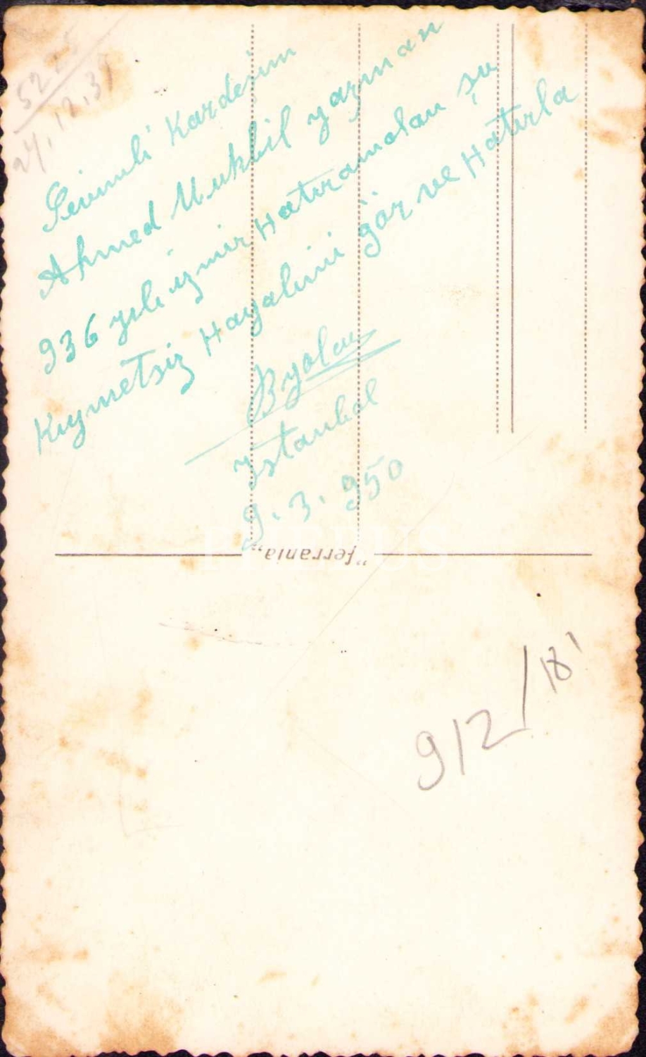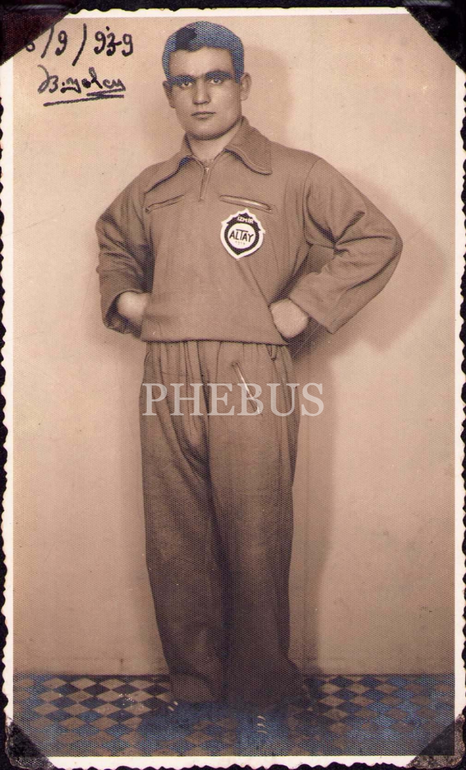 İzmir Altay SK eşofman takımıyla poz vermiş beyefendinin hatıra fotoğrafı, 1950 tarihli ithaf yazısıyla