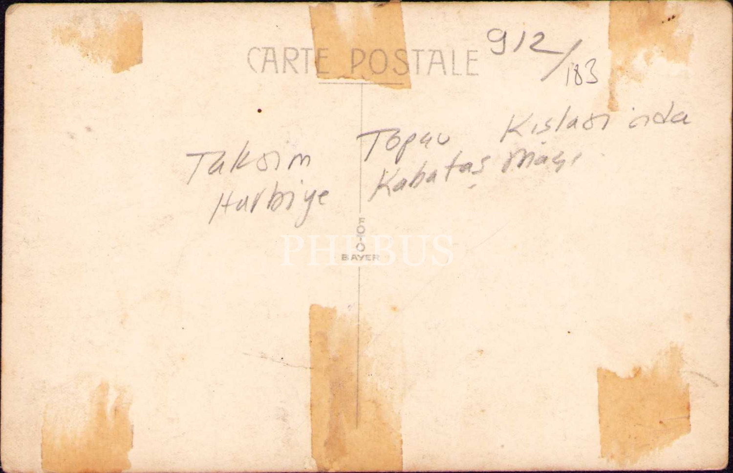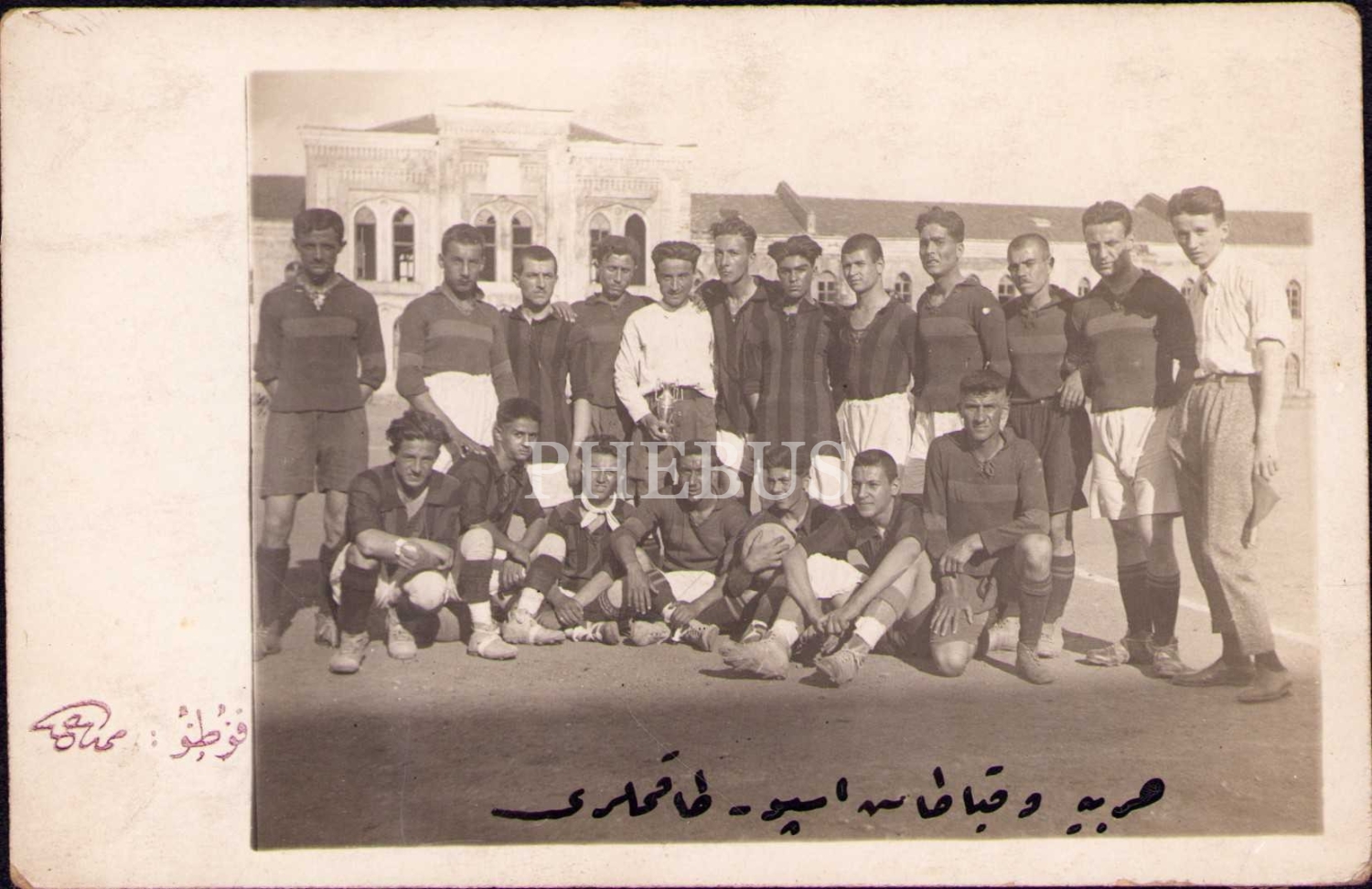Taksim Stadı'nda [Topçu Kışlası] Harbiye ve Kabataş spor takımlarının hatıra fotoğrafı, Osmanlıca fotoğrafçı damgalı