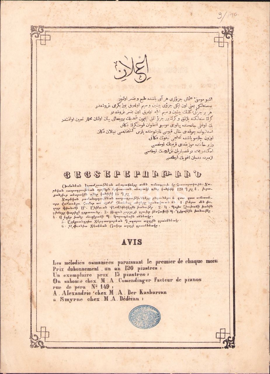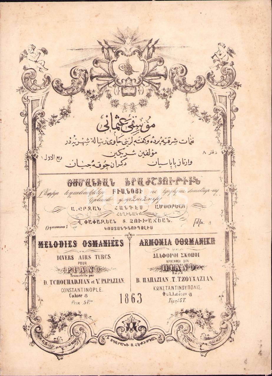 Osmanlıca-Ermenice-Fransızca-Rumca kapak yazılarıyla 1863 tarihli Musiki-i Osmani Risalesi, Dikran Çuhacıyan-V. Papazyan, 24x34 cm