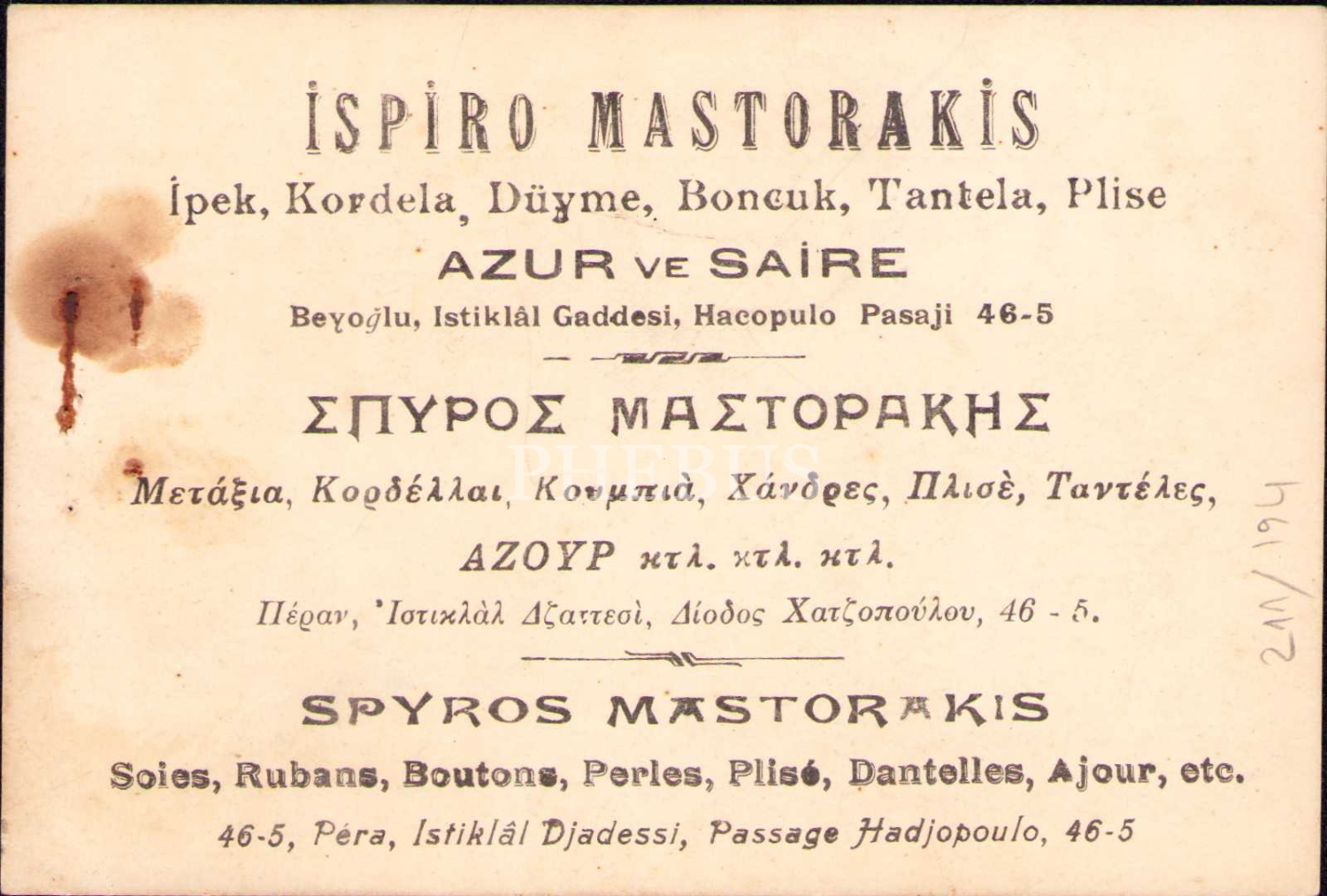 İspiro Mastorakis tuhafiye mağazasına ait ve Muhsin Ertuğrul imzalı Türkçe-Grekçe-Fransızca reklam kartı, Beyoğlu, 9x13 cm