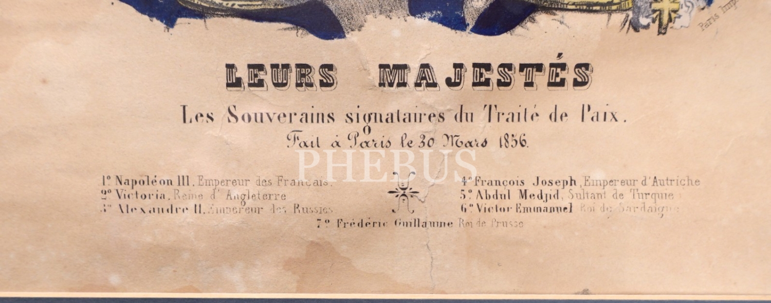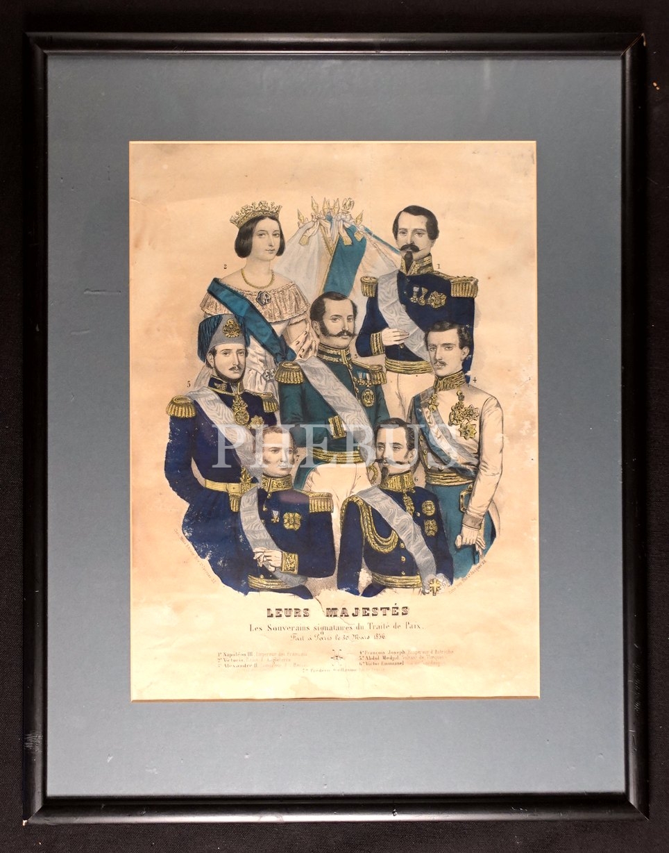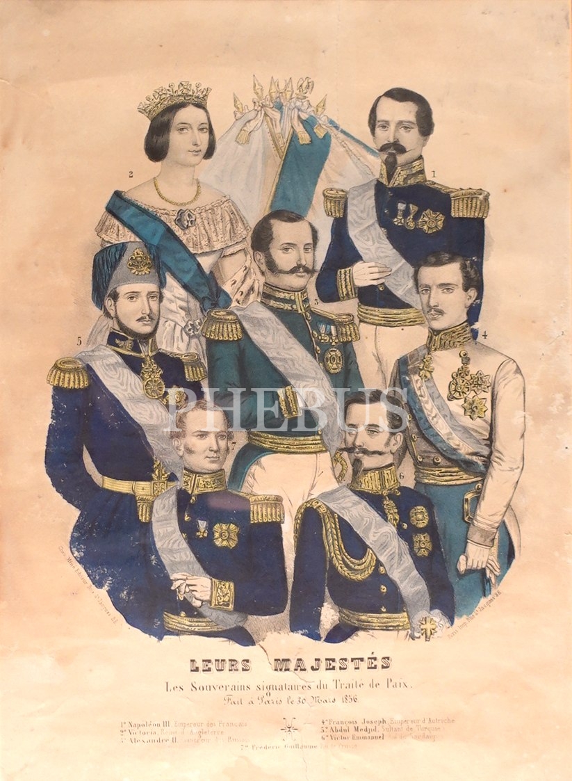 1. Fransız İmparatoru III. Napolyon, 2. İngiltere Kraliçesi Victoria, 3. Rusya İmparatoru II. Aleksandr, 4. Avusturya İmparatoru François Joseph, 5. Sultan Abdülmecid, 6. Sardunya Kralı Victor Emmanuel, 7. Prusya Kralı Frederic Guillaume