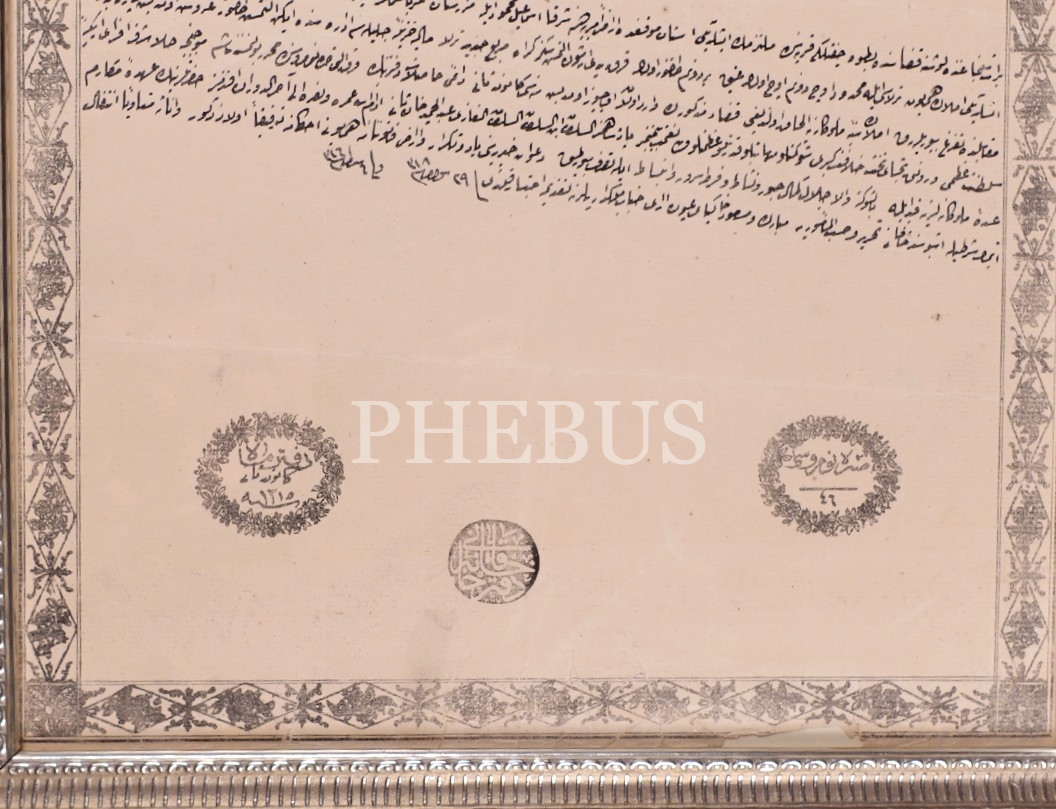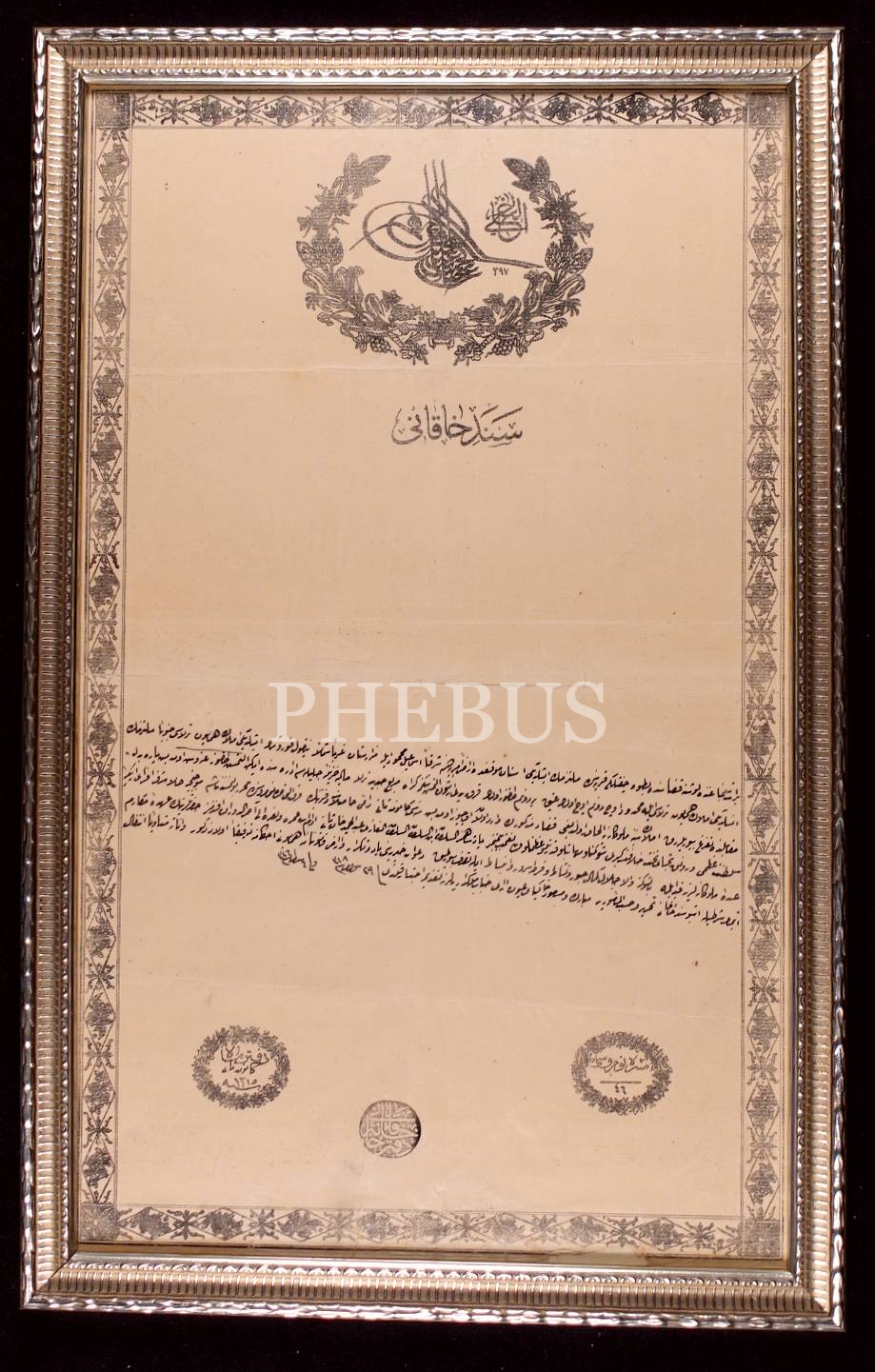 Berat sancağında olup karşılığında hanedan mülkü haline gelen bir tarlanın el-Gazi [2. Abdülhamid] tuğralı ve 1318 tarihli tapu senedi, çerçeve: 32x51 cm