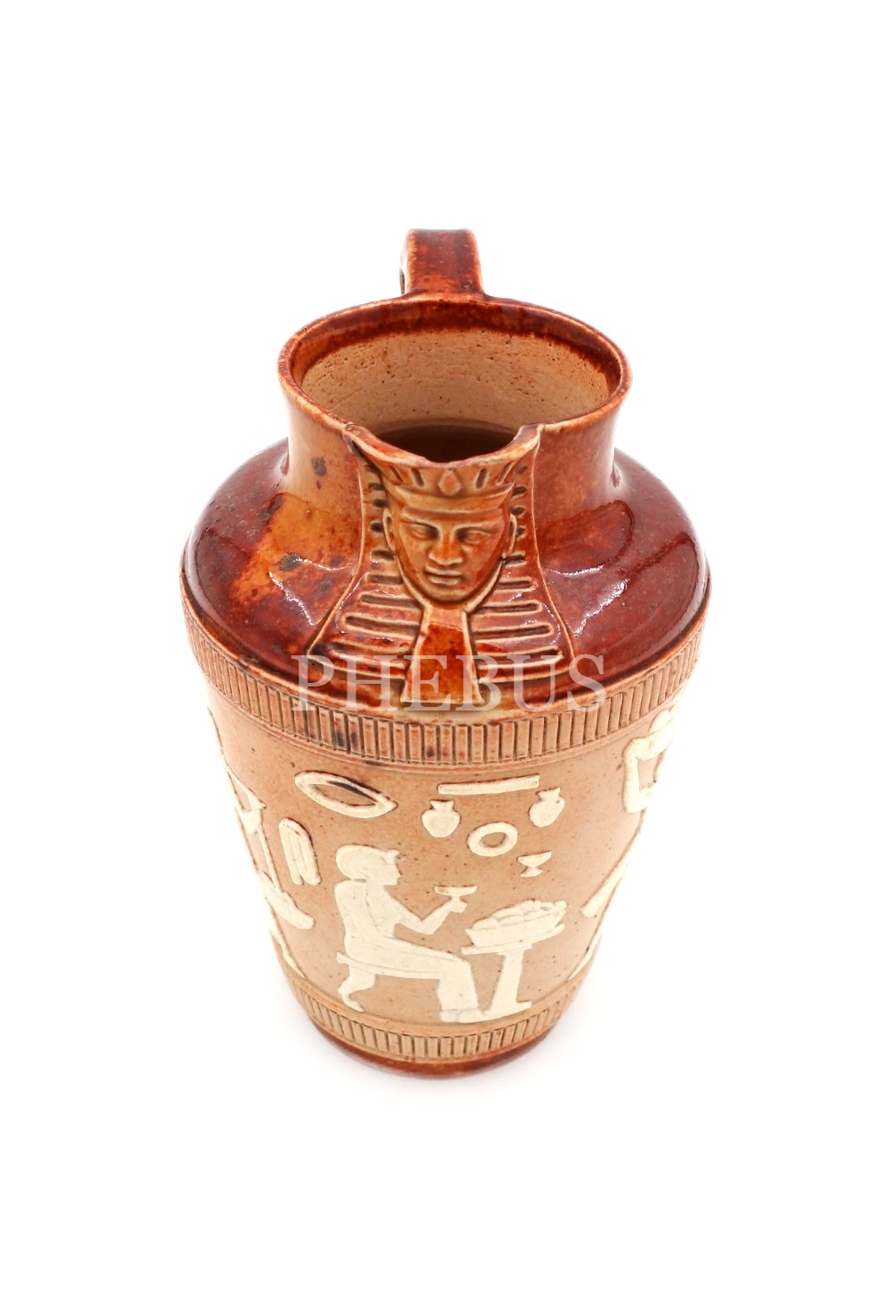 Koleksiyonumuzdaki sütlük, klasik İngiliz seramik sanatını, renk skalası ve çalışma kalitesini gösterirken aynı zamanda İngiliz Ünlü Seramik Ustası Annie Neal imzası taşımaktadır. Sütlük ağız kısmında antik Mısır’da mimari esereleri süsleyen yüz formu arka sap kısmında ise kabartma desenli olarak Horus’un kanatları görülmektedir. Gövde kısmında ise Antik Mısır duvar süslemelerinde gözüken günlük yaşamdan karaler sütlü kahve zemin üzerine beyaz kabarma motiflenmişlerdir.