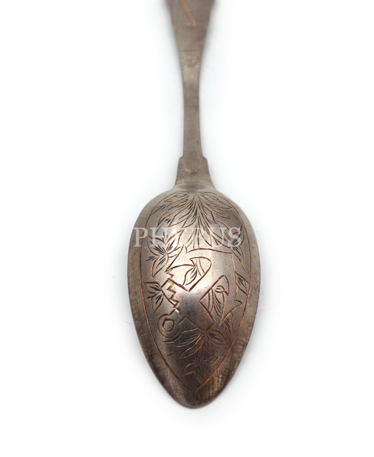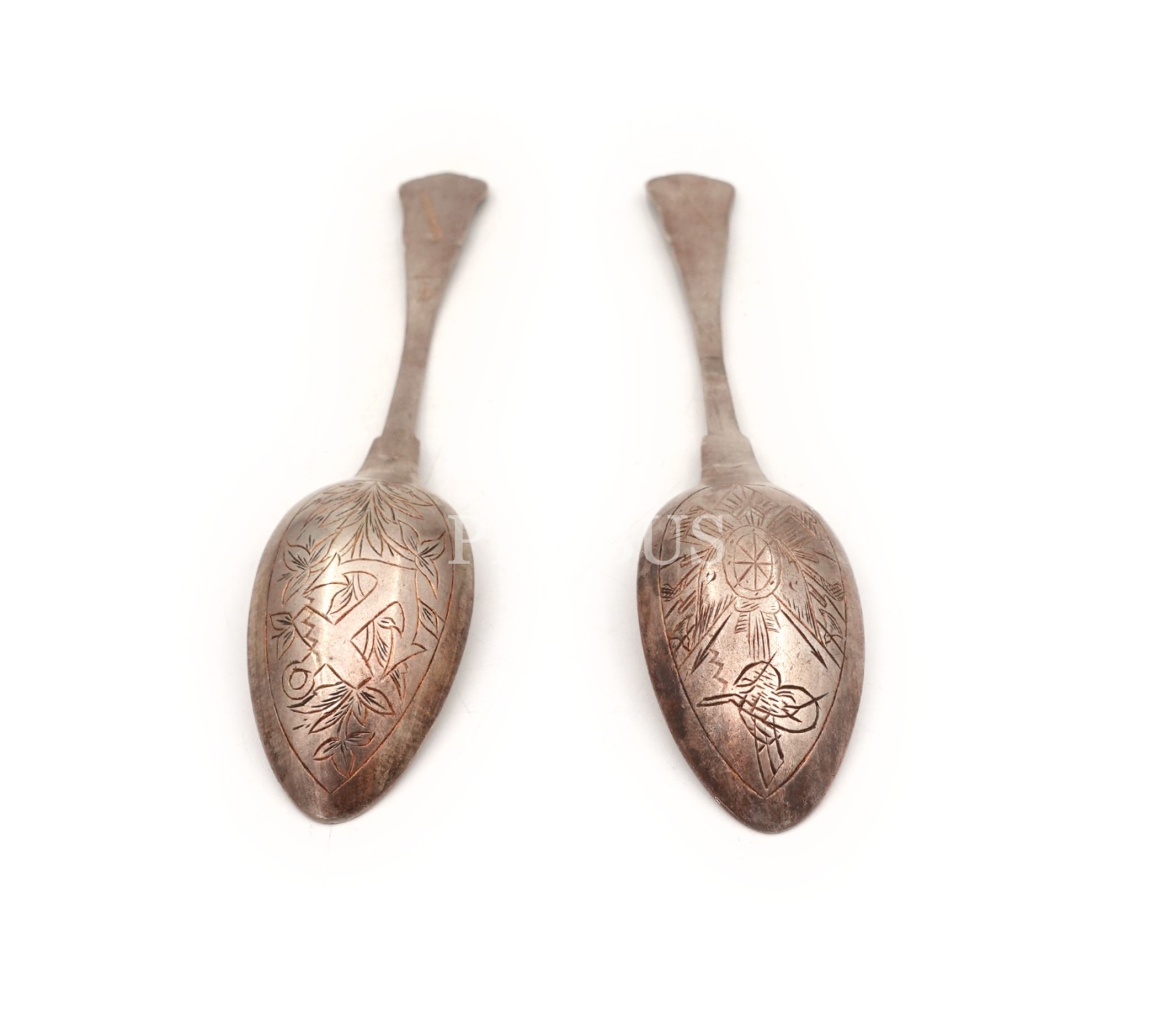 Osmanlı tuğralı, sah damgalı ve üzeri kalem işçilikli çift murassa kaşık. Gövde üzeri floral kabartma işçilikli olan kaşıkların sap ucuna doğru inisiyal kısmı mevcut olup, hazne kısımlarının dışlarının birinde Donanma-Amire arması, diğerinde ise Osmanlı Devlet arması mevcuttur.