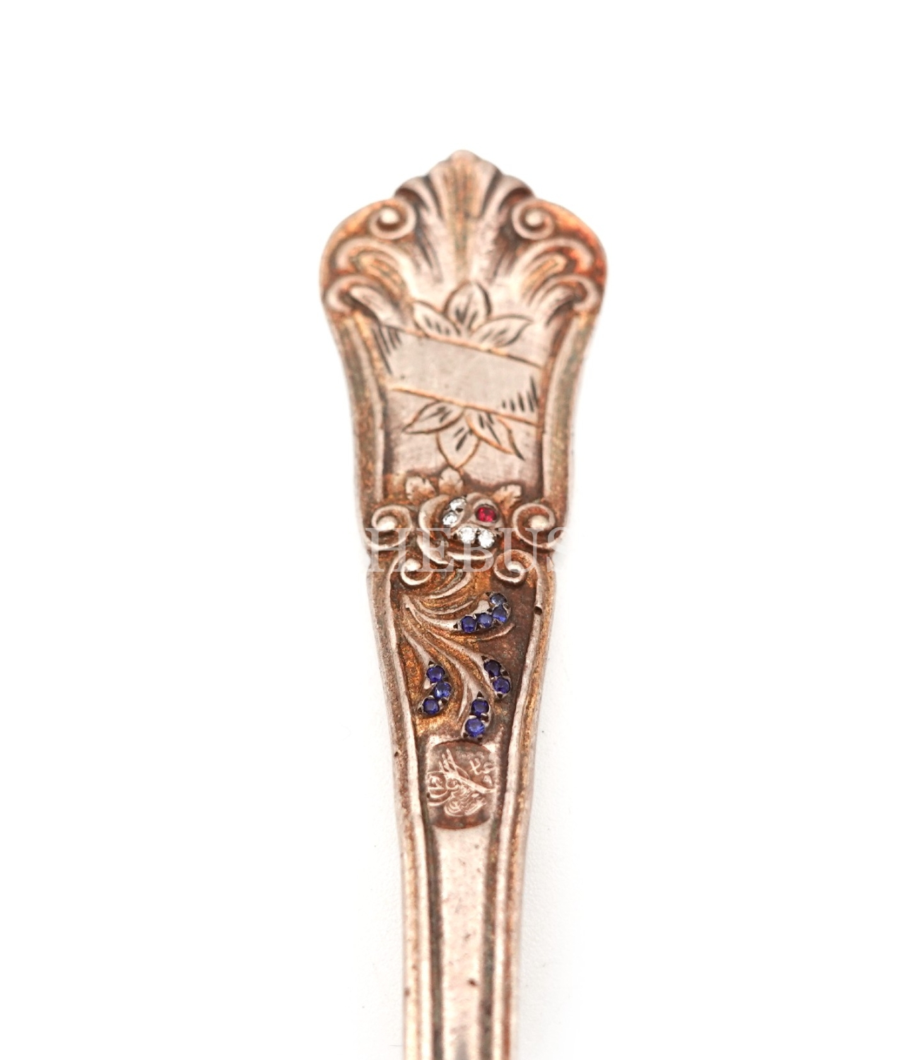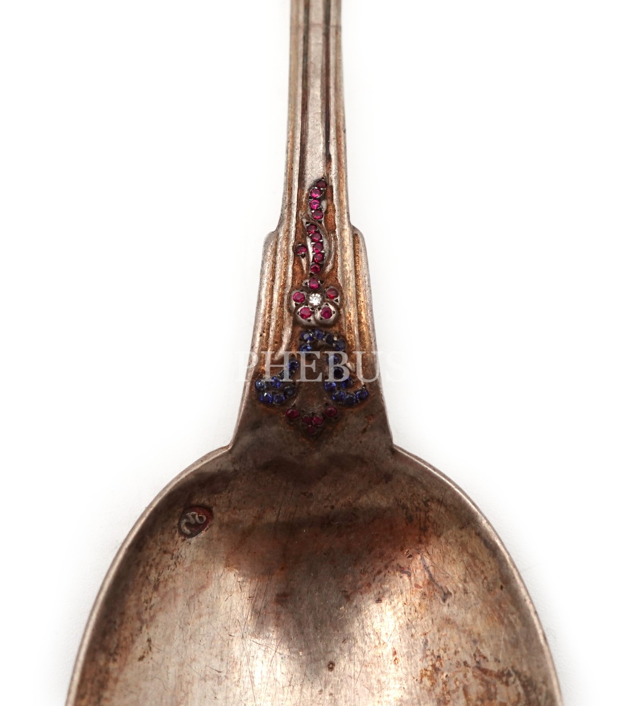 Kaşık uzunluğu 18 cm - Tek kaşık üzerinde kırıntı şeklinde 28 adet safir / 5 adet pırlanta / 20 adet yakut mevcuttur.