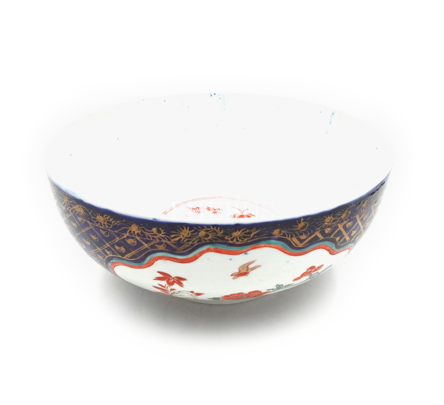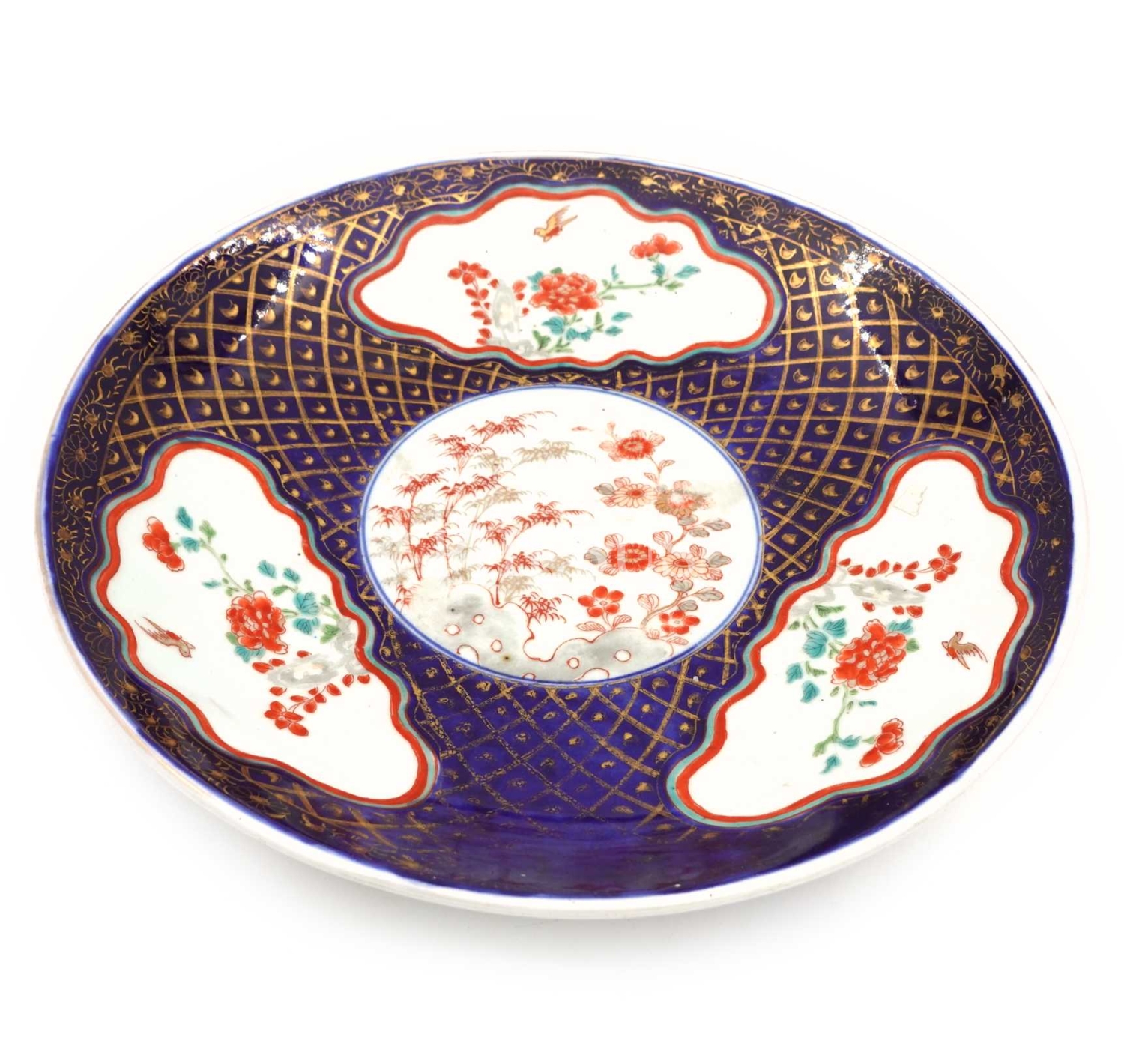 19. yy'dan Çin Cantone stili büyük boy porselen tabak ve kase, Cobalt üzeri kiremit, yeşil renkli floral desenler ve altın işçilik ile süslenmiştir.