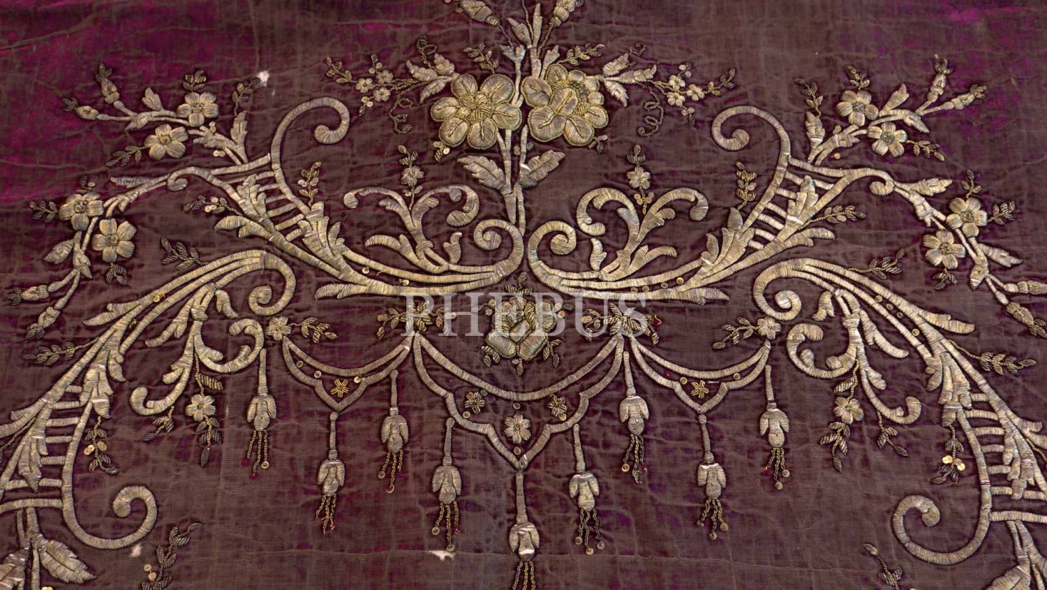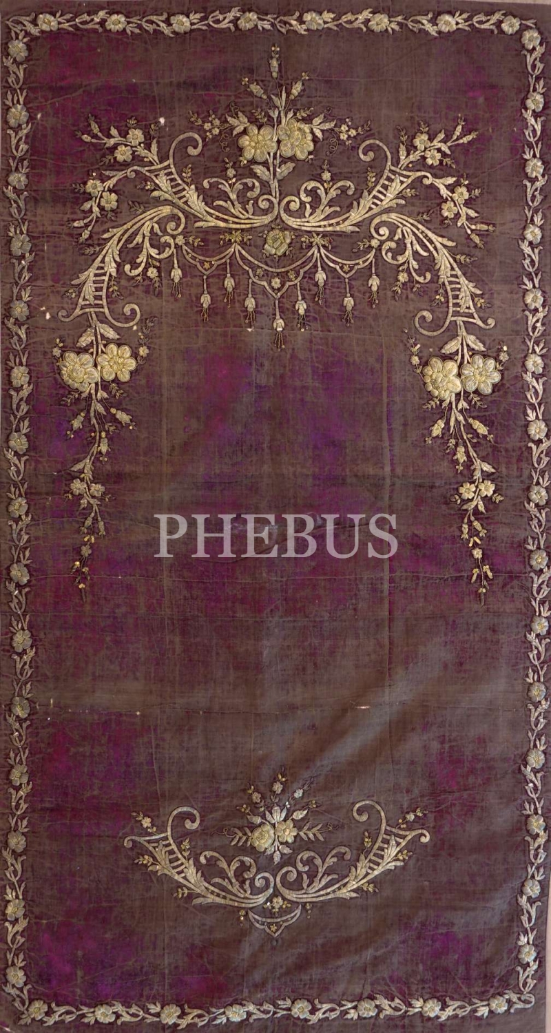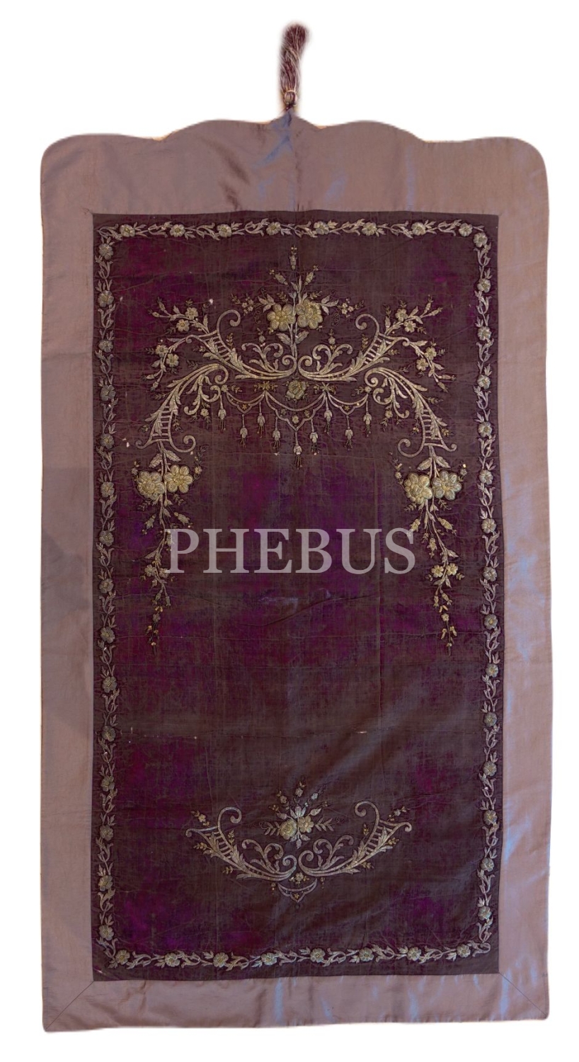 Osmanlı döneminden ipek atlas üzerine altın tel kırma işçilikli ve kenarları dore renk çerçeveye alınmış uç kısmı püsküllü seccade, 82x152 cm